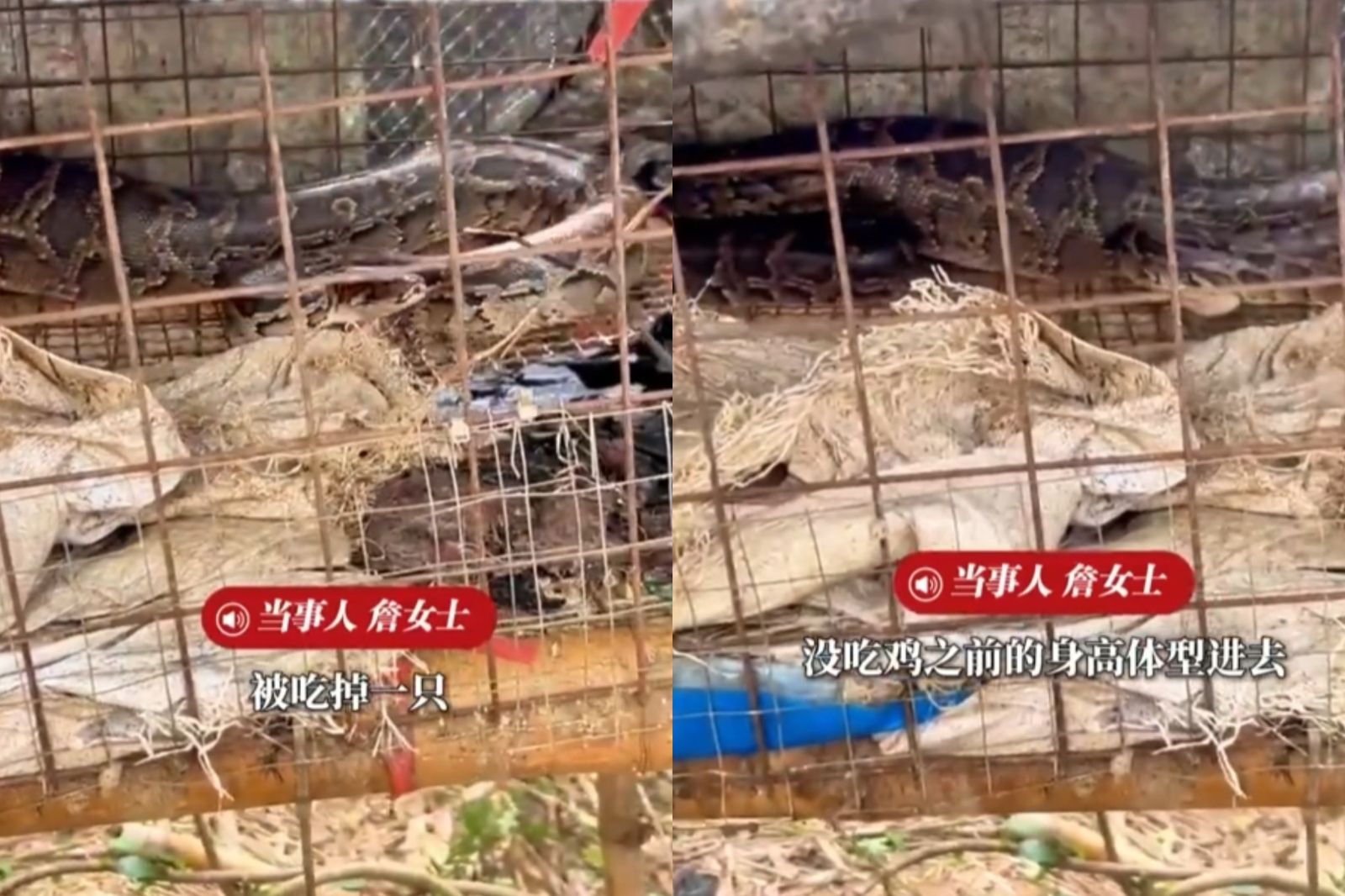 根據《荔枝新聞》報導,中國福建漳州平和縣一名詹姓女子,像往常一樣前往自家雞籠餵雞,沒想到才剛走近,就感覺雞籠很安靜,仔細一看才發現有隻蟒蛇蜷縮在裡面,然而原本雞籠有7隻雞,檢查後確認有1隻被蟒蛇吞下、1隻被咬死。詹女表示,應該是雞籠的縫隙,能讓蟒蛇在沒吃雞之前的體型進去,吃飽「變胖」後則卡住出不來。