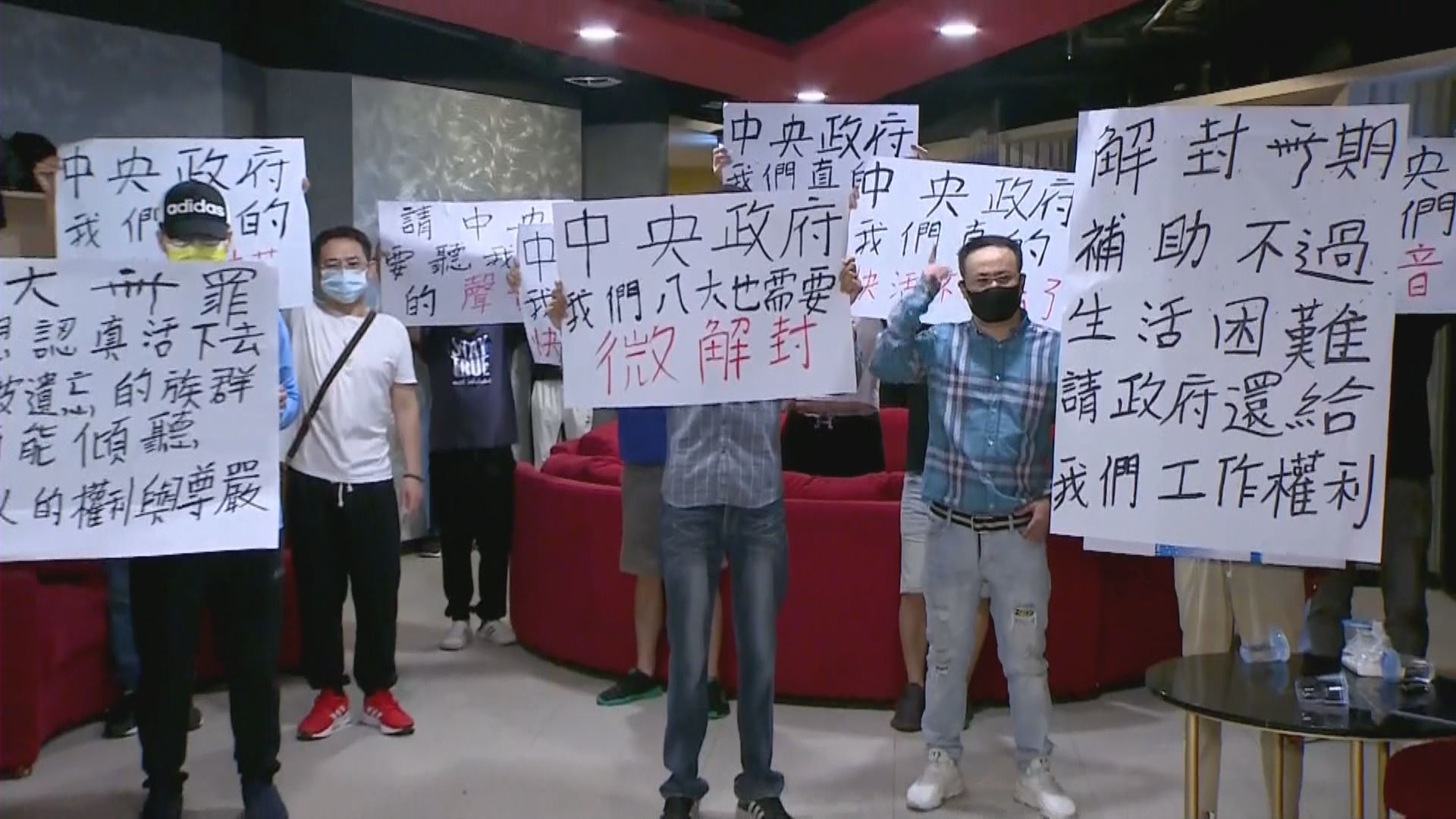 高舉白布條跟標語,八大停業近4個月,業者員工只能喝西北風,出面呼籲政府趕快重新開放,業者的心聲行政院聽到了,行政院長蘇貞昌23日表示:「越來越開放,但是不敢一步跳太快,我們現在如果穩定,會漸漸一直開放。」