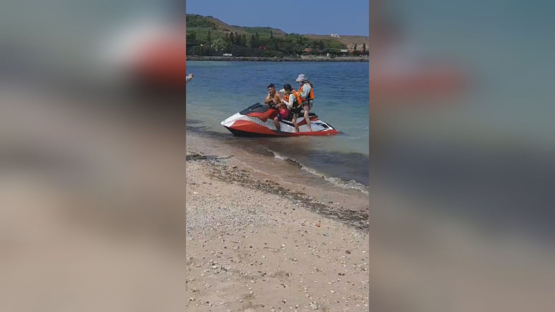 海巡人員騎著水上摩托車,將遊客從遊艇上接回岸邊,一艘馬來西亞籍的遊艇,從澎湖馬公港報關出海,接近中午,驚傳擱淺在距離望安漁港外約20公尺海域,船上9名遊客及3名船員飽受驚嚇。