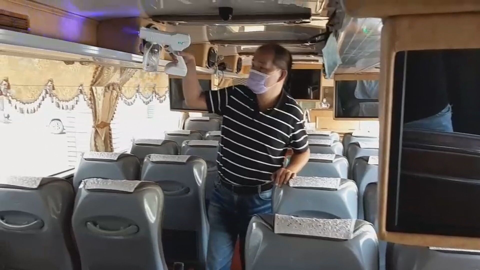遊覽車司機,拿起酒精仔細消毒,國內疫情趨緩,疫情指揮中心27日宣布,陸續放寬防疫管制措施,原本規定只能採梅花座的遊覽車,取消載客上限,一車可以載滿滿,讓遊覽車業者,終於盼到生意回流。
