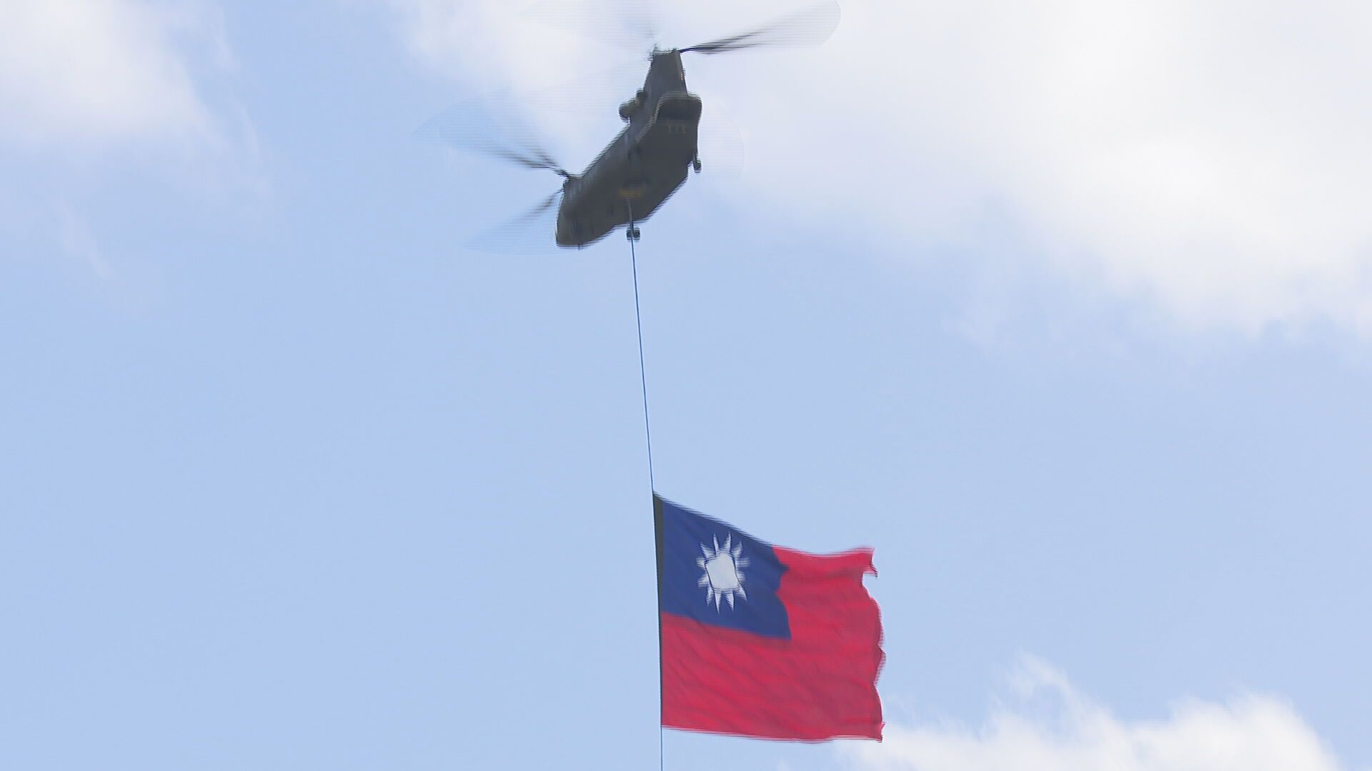 官兵頂著風壓,掛上捆旗,就等升空,拉開讓旗面飄揚。陸航空運作戰隊分隊長陳宏基表示:「而最適合本次吊掛飛行的地速,為45海里,最大的困難就是要在每一次的測試階段,我們都要試出旗幟,他要撕裂的一個狀況。」那我們也是每次都要驗證,國旗展旗的狀況。