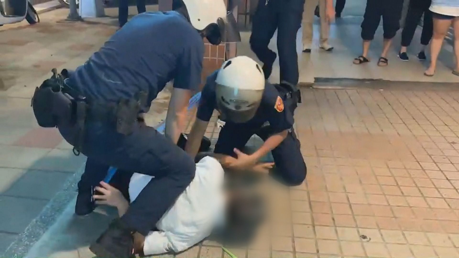警方獲報,白衣男子在社區車道前,擋住車輛進出,趕緊上前勸離,王姓男子喊:「我一定會告你,我一定會告你。」只見阿北拒絕配合,不斷掙扎還推擠員警,直接就被壓制上銬,場面混亂。