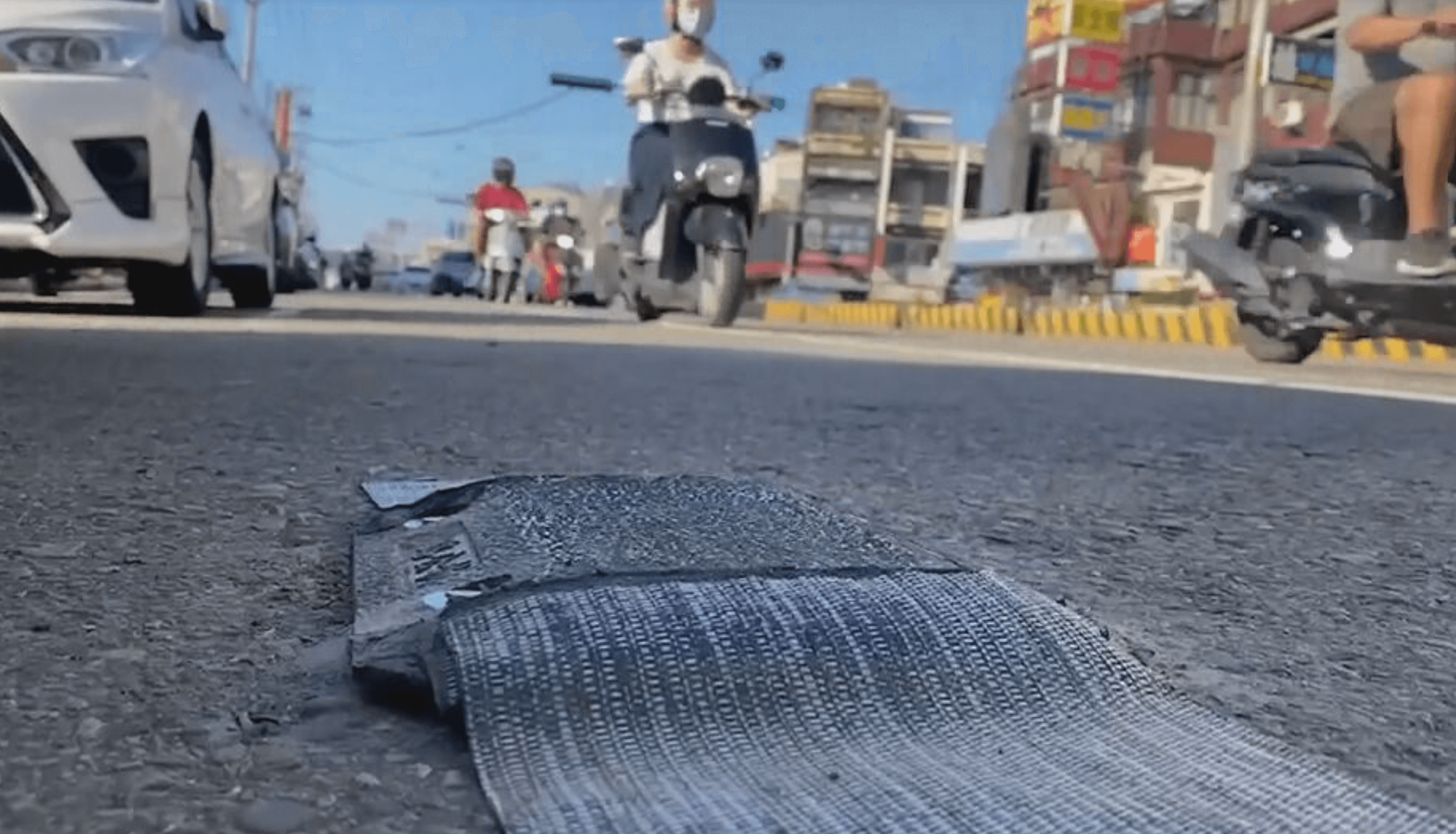馬路上車水馬龍,但最外側車道路面被民眾直擊,發現有一個黑色突起物,附近民眾表示:「我也不知道那個是什麼東西,可是那個中華路是我每天上班,每天要騎的地方,所以有突起物的話,有時候車速太快可能會滑倒。」