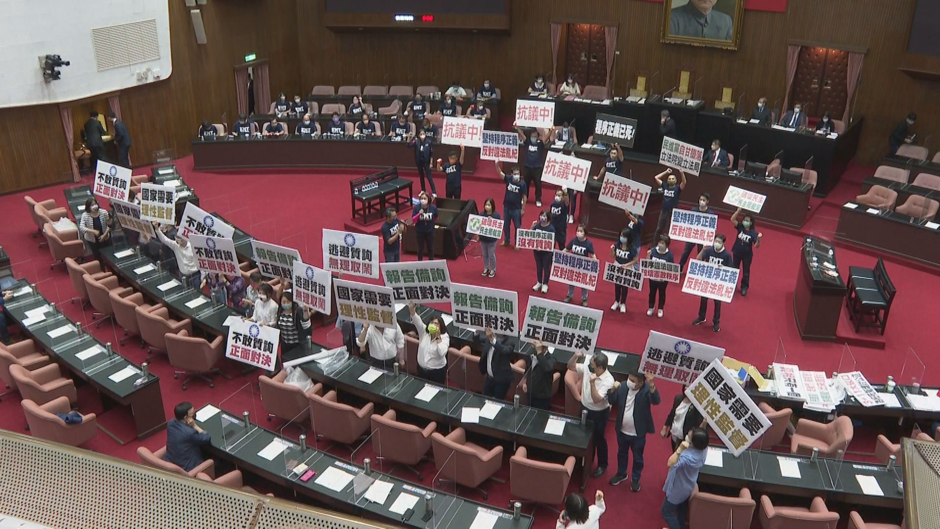 大喊口號諷刺民進黨獨裁專政,但綠營早有準備,民進黨同樣搬出手板,反諷國民黨不敢正面對決,就這樣藍綠陣營你喊你的、我喊我的,立法院再度空轉一個上午。