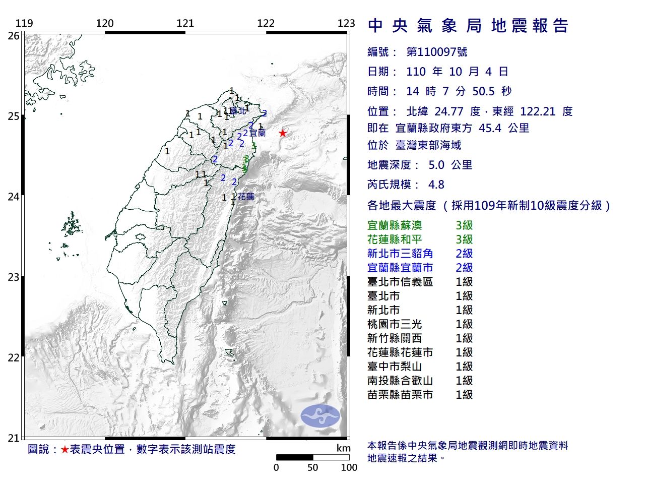 中央氣象局地震報告指出,各地最大震度分別為:宜蘭縣蘇澳、花蓮縣和平3級;新北市三貂角、宜蘭縣宜蘭市2級。