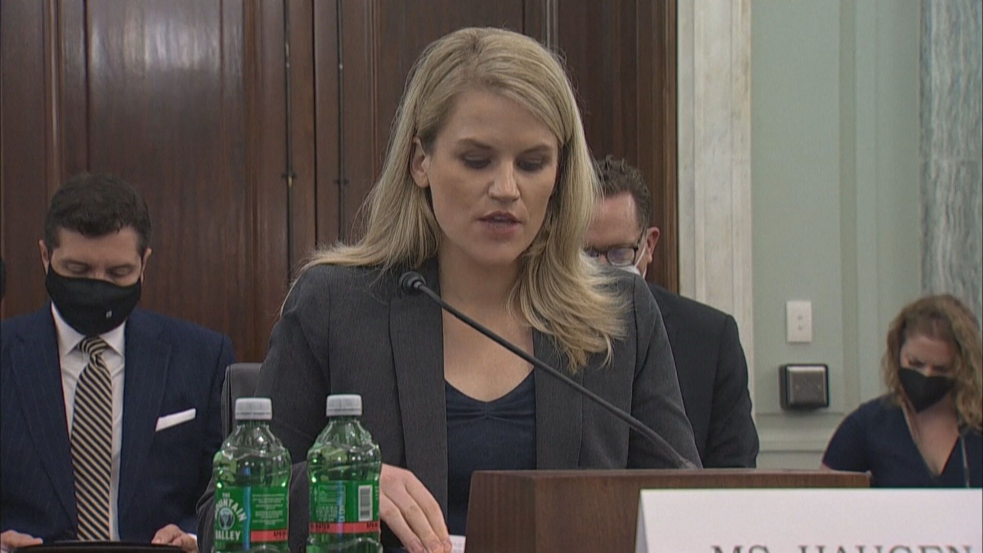 這位身穿套裝、神情嚴肅的女子,就是揭發臉書內幕的吹哨人郝根,現年37歲,2019到2021年曾在臉書擔任產品經理。前臉書產品經理郝根呼籲:「國會需要採取行動,沒有你們的幫助,他們(臉書)不會解決這場危機。」