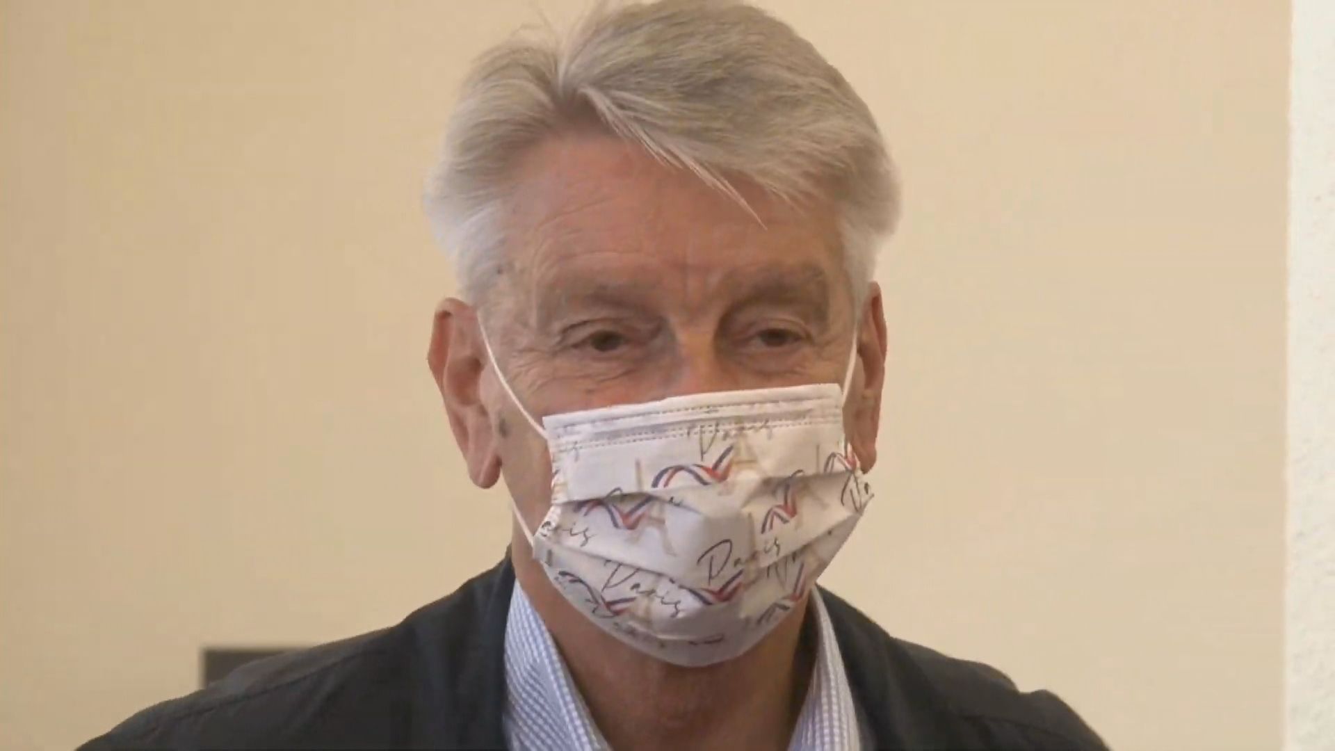 對鏡頭揮揮手,用法文說「大家早」,還戴上印有巴黎鐵塔的口罩,法國參議院友台小組主席李察不畏中國壓力,6日上午抵達台灣。