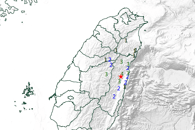 花蓮縣地區最大震度4級,南投縣地區最大震度3級,台中市地區最大震度2級,宜蘭縣部分地區也可以感覺到1級震度。
