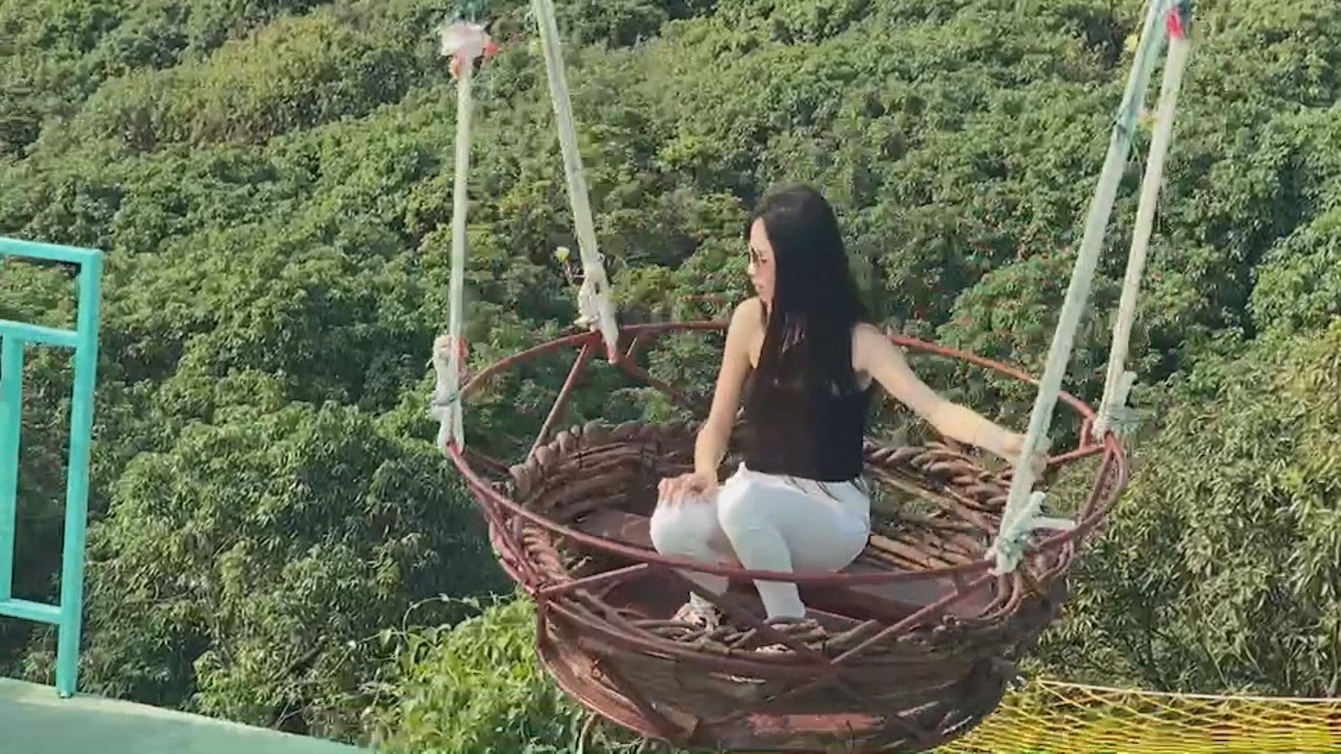 坐在超大鞦韆上來回擺盪,底下是一片翠綠森林,一望無際的藍天白雲,絕美景色吸引許多民眾前來打卡拍照。景觀餐廳工作人員提醒:「如果要拍正面的話,自己轉過來喔。」