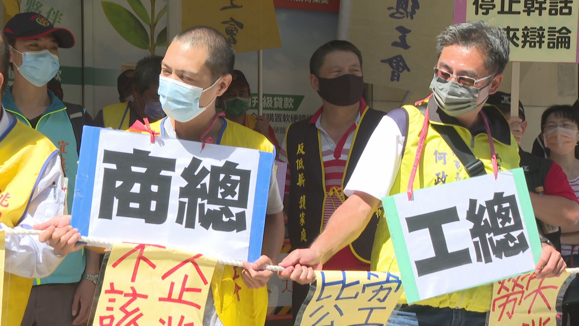 趕在基本工資審議前一天,勞工團體直搗工總、商總一樓門口,呼籲資方審議委員別再出手阻擋基本工資調漲,甚至一度要衝上去,希望直接跟資方對話。