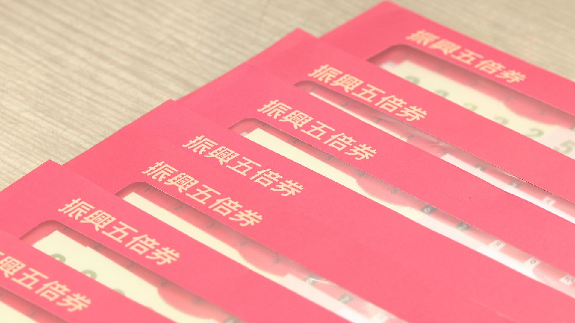 超市工作人員反覆清點整疊的實體五倍券,光是10份就價值新台幣5萬元,趕在民眾領取的前一天確認再確認,還得鎖在保險箱保存。