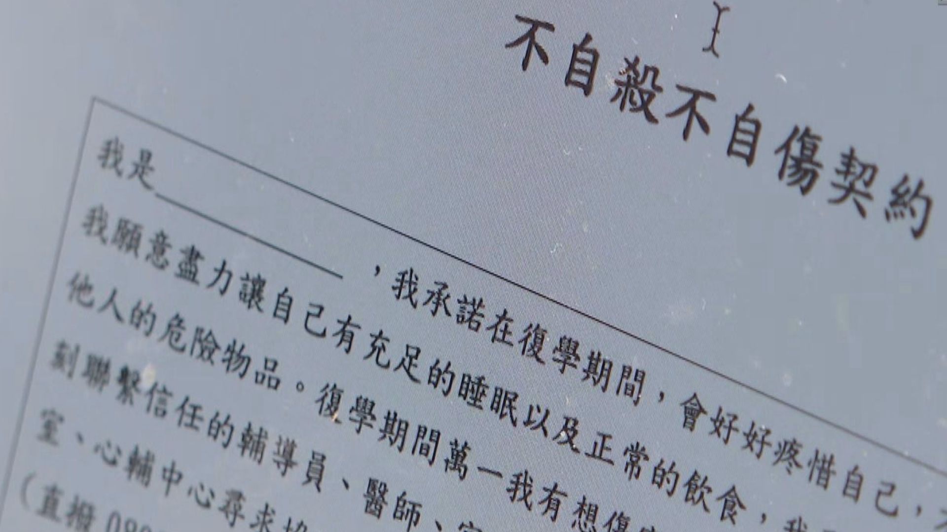 大專院校剛開課,不過就有台大學生進校前,被通知要簽下「不自殺契約」,原來這名女學生因為身心關係休學一年,結果復學不久,收到助教寄給家長的通知,要她簽下「諮商同意書」「晤談基本資料卡」和「不自殺契約」。雖然校方解釋單純關懷,不強迫簽署,但因為沒有事先面對面輔導或諮商,程序讓女同學覺得很不舒服,連心理諮商師也認為,過程太粗糙。