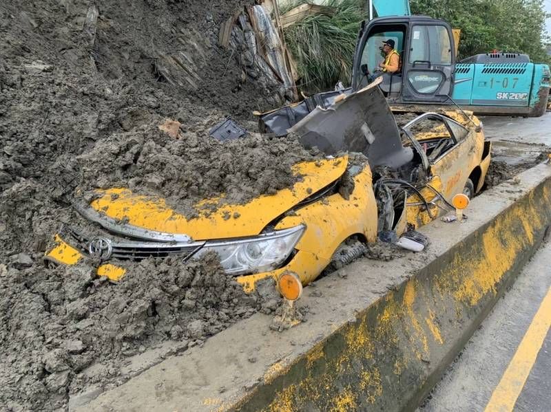 桃園市政府消防局第一大隊迴龍於凌晨4時44分接獲通報,指東萬壽路上有土石倒塌,壓垮計程車,總計出動9車22人。分隊長吳浚澤表示,經現場3台重機具協助開挖搶救,今天上午6時37分救出戴男,目視戴男明顯死亡未送醫,公路局中壢工務段正在現場清運,並清查有無人員受困。