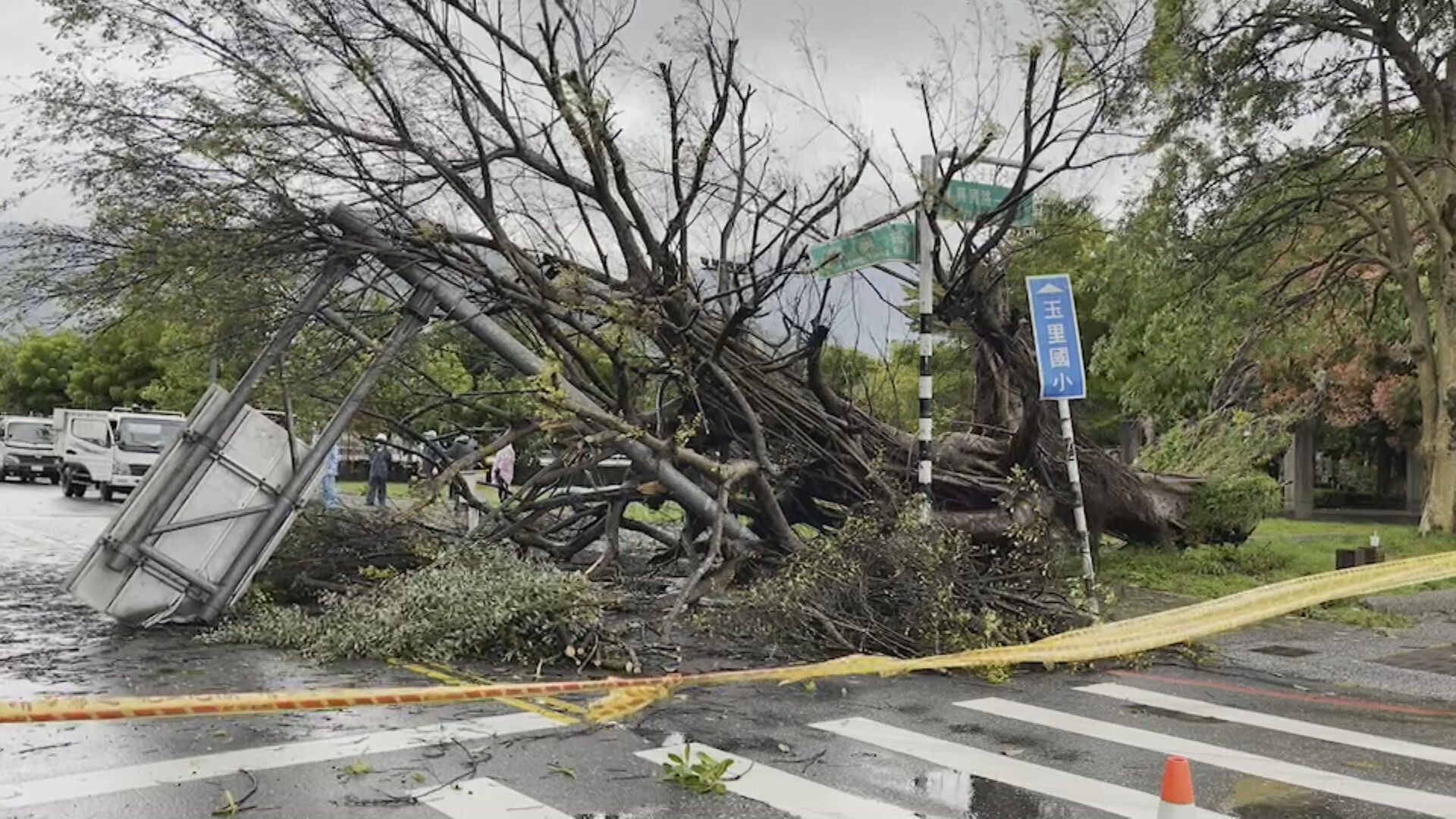 11日深夜連假最後一天,宜蘭冬山鄉停電,一片黑壓壓,台東還有路樹被吹倒,池上鄉一棵巨型榕樹被連根拔起,壓壞車輛。