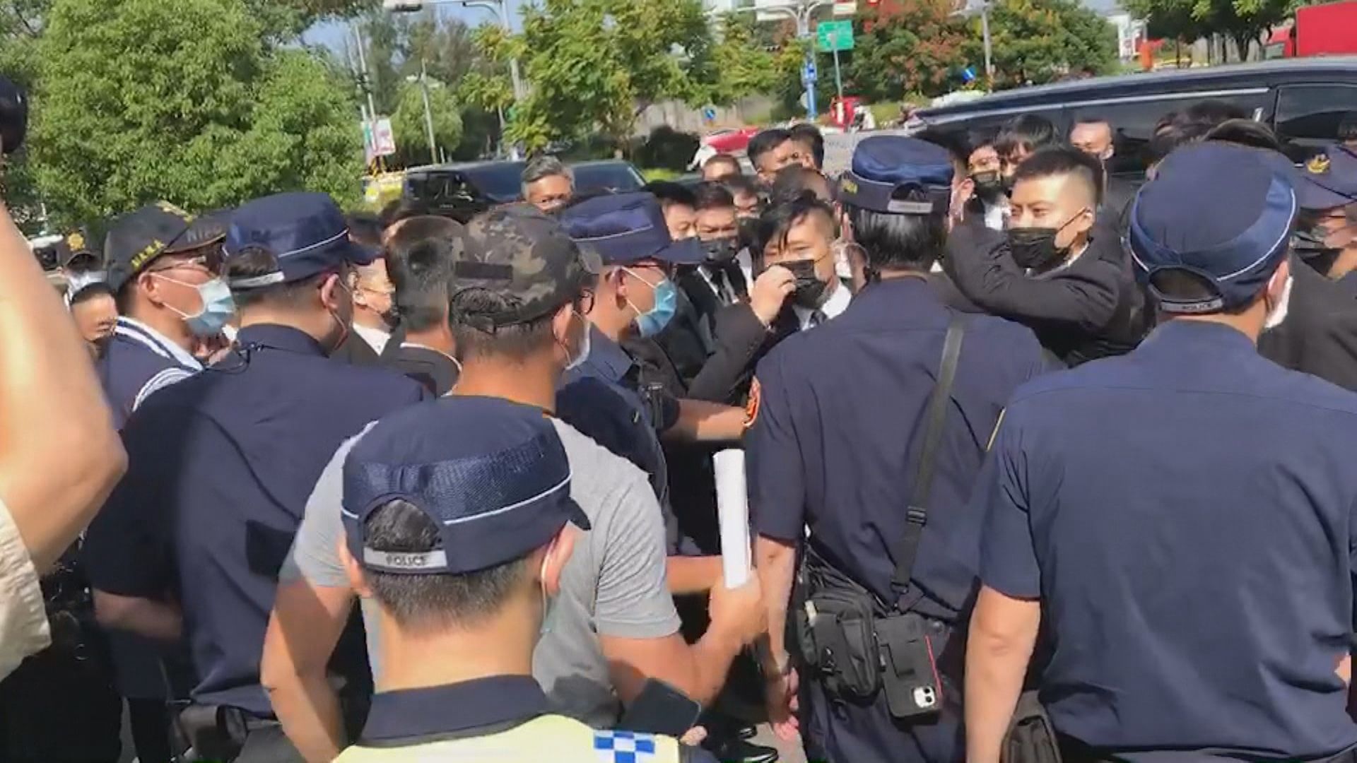 都還沒進入公祭會場,黑衣人就開始推擠拉扯,差點和員警打了起來,混亂中梳著油頭,戴黑色口罩的就是天道盟大哥,綽號「鐵霸」的曾盈富。