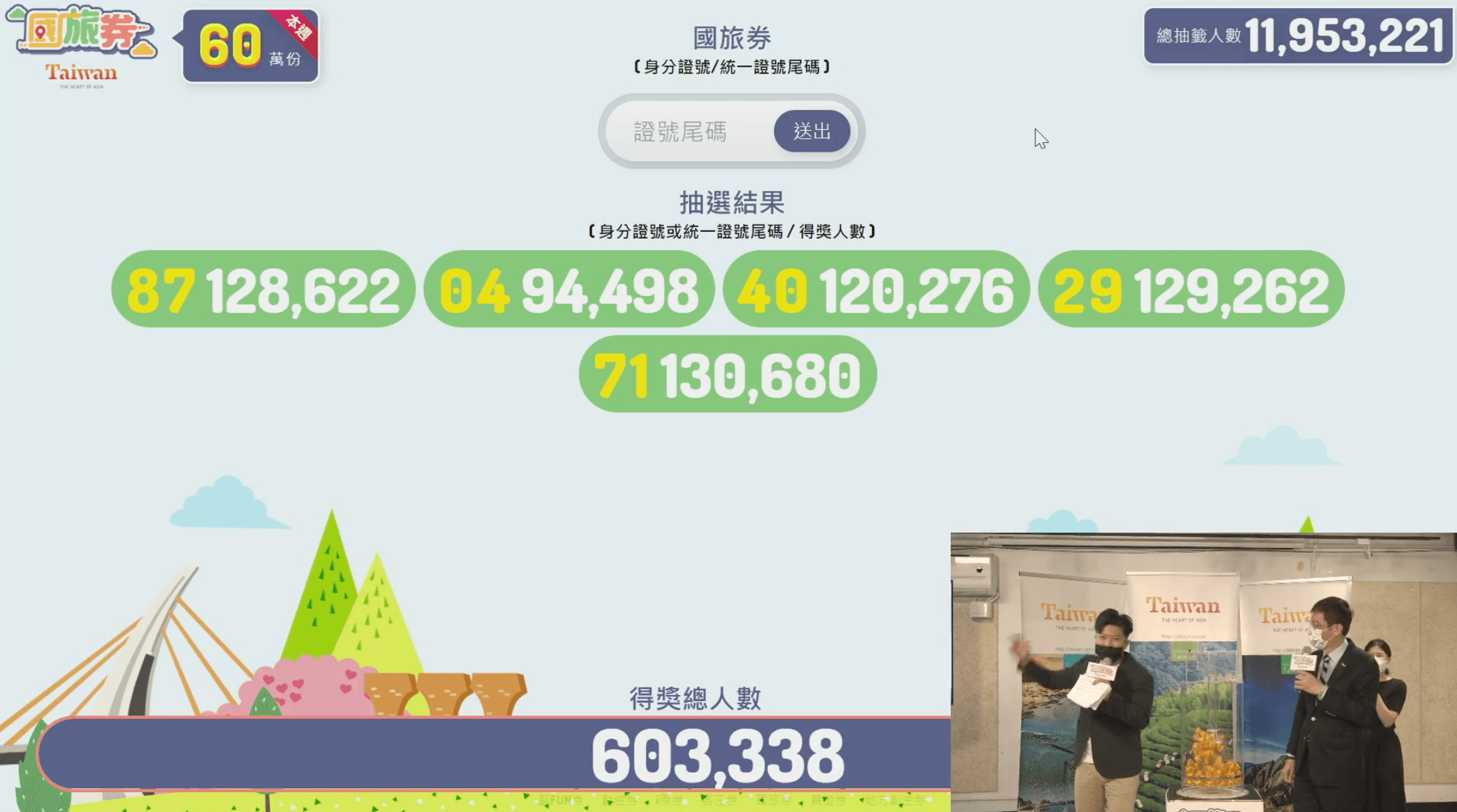 行政院推出振興五倍券刺激經濟消費,各部會也祭出加碼券,其中面額最大的國旅券,總計有總計有240萬名額,上週抽出60多萬名幸運兒後,19日上午10點30分進行第二波抽籤,同樣抽出約60萬份,這次是身分證尾數04、29、40、71、87的民眾中獎。
