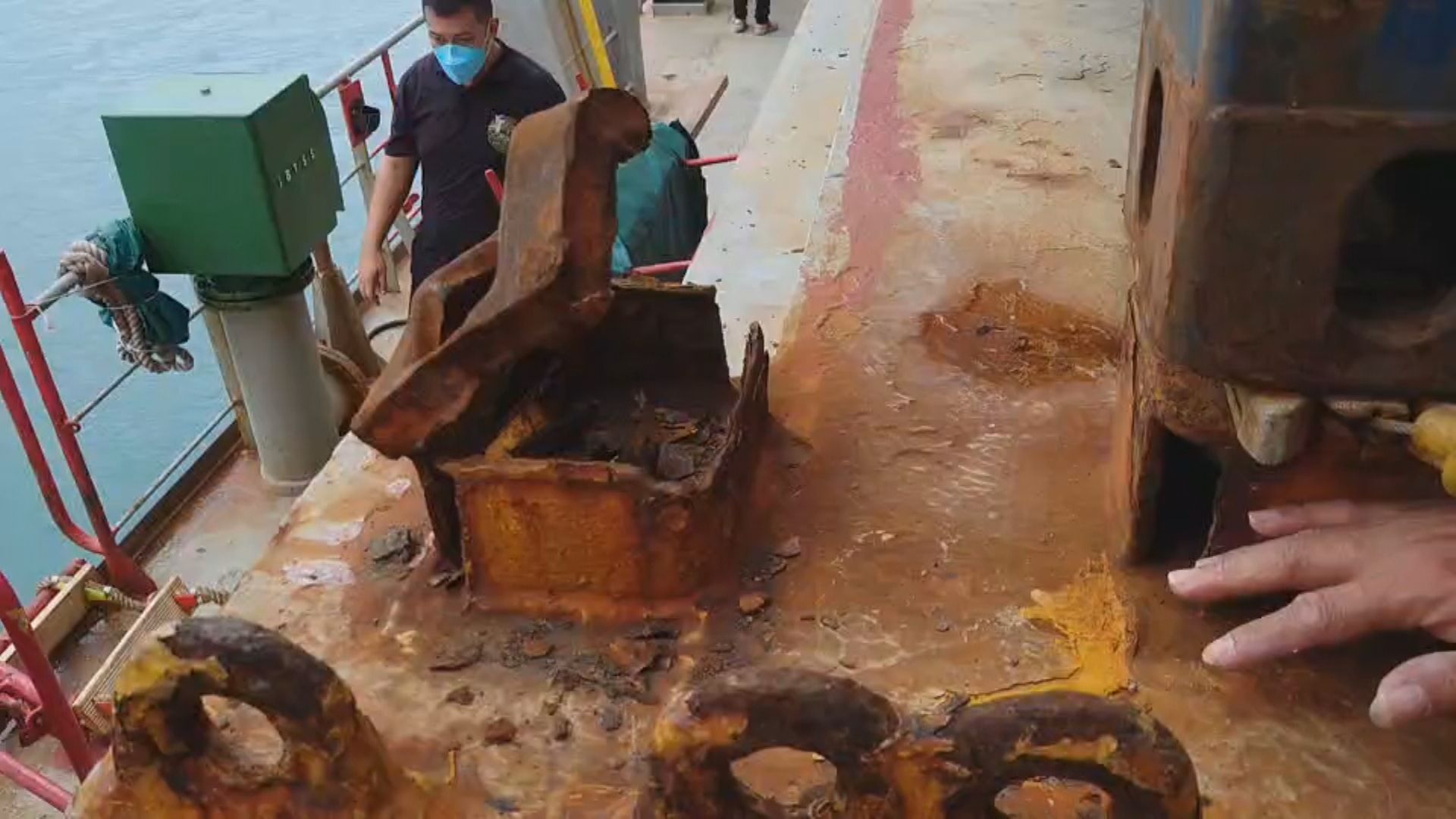 某物流公司目擊員工說:「就是這地方崩裂,這裡全都生鏽,你看機械強度不夠 它整個崩裂,等於說船在漂動,這個是鎖貨櫃的卡榫,對,那它是不是(應該)咬住,這個就崩裂。」