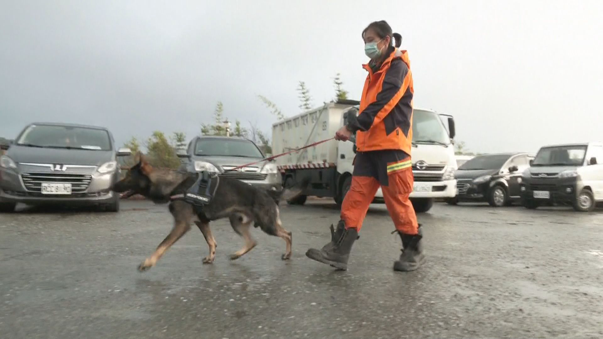 領犬員牽著搜救犬準備執行搜救任務,這隻白色的傑克羅素犬叫做浩克,最近參與過花蓮太魯閣事故救援案。救援行動除了增加到400名人力,又加入6隻搜救犬來支援,他們是B級高級搜救犬,專長行蹤追跡,還有山區搜索、地震救災,像是瓦礫堆地形都難不倒牠們。