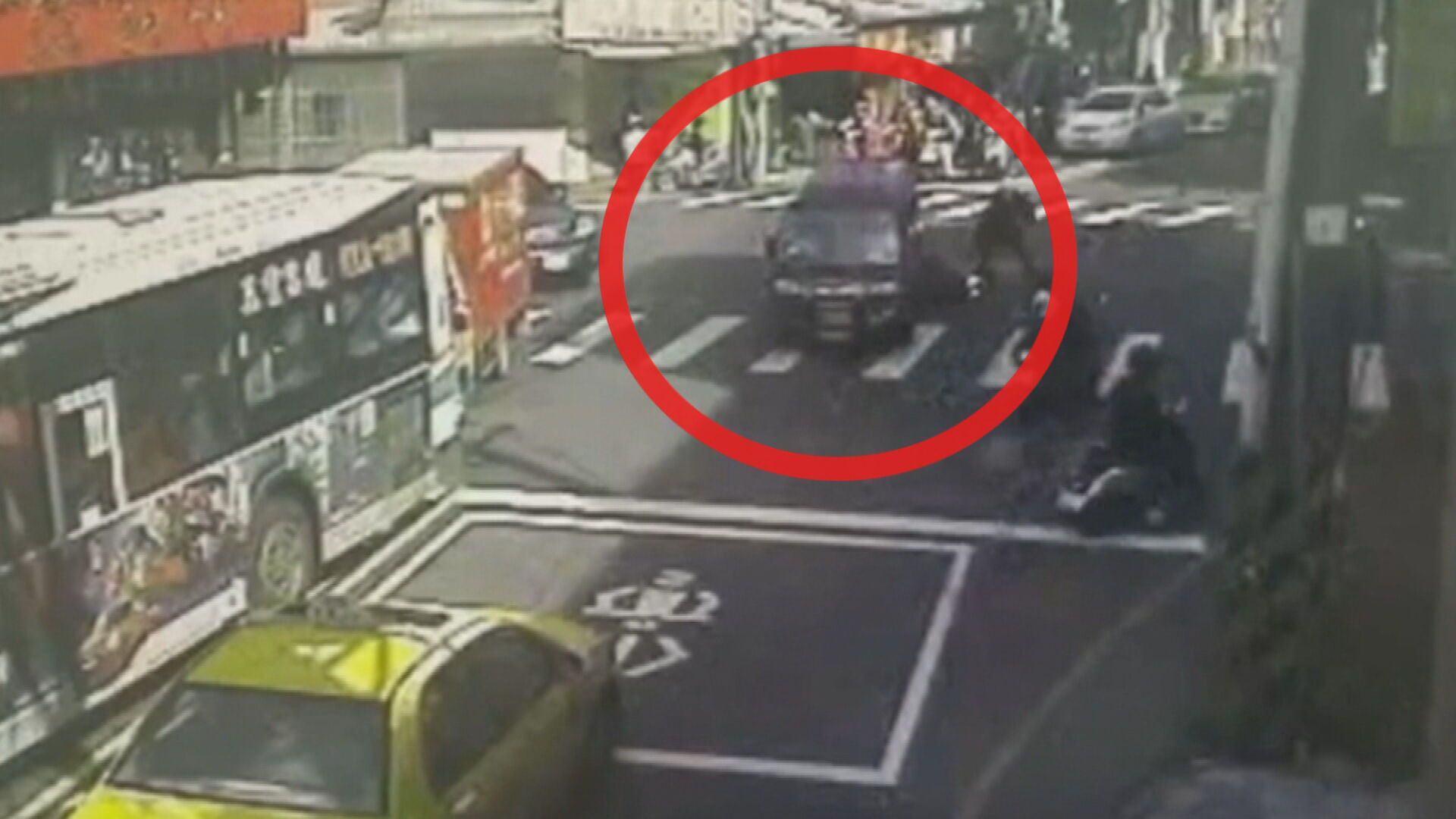 警方追逐紅色廂型車,一路追到十字路口,下一秒它卻突然倒退,撞倒員警,還差點輾了過去,幸好員警反應快,馬上跑到駕駛座旁,想阻止對方逃逸。換個角度來看,員警拉住方向盤,整個人就直接掛在車門上,跟著廂型車在大馬路中央,足足繞了3圈,最後失控撞上路邊電線桿,才停下來。