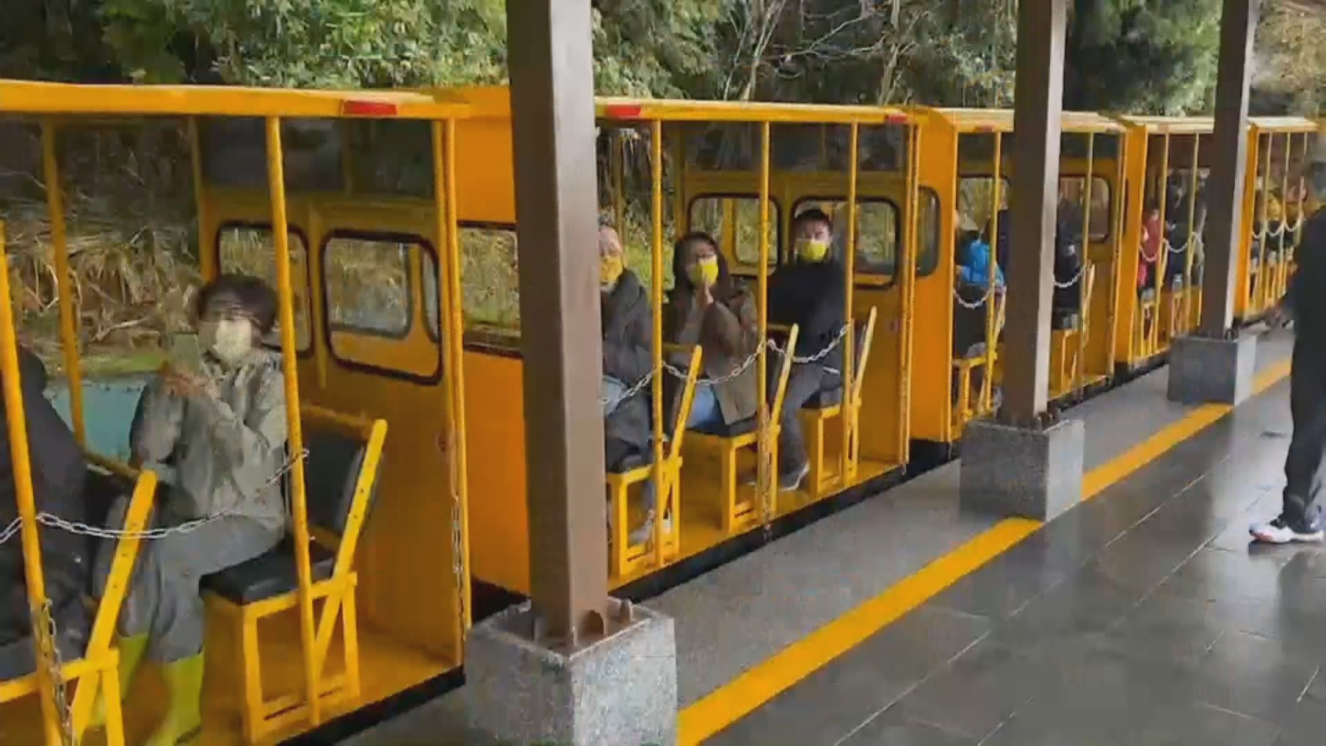 遊客搭乘蹦蹦車,穿梭在雲霧繚繞的山林間,開放第一天就湧入大批人潮,甚至有遊客特地一早來搶頭香。搭乘蹦蹦車民眾:「我早上五點半就出來排隊了,當第一個排隊的,等一下就要上去坐(列車)了,感覺非常興奮。」