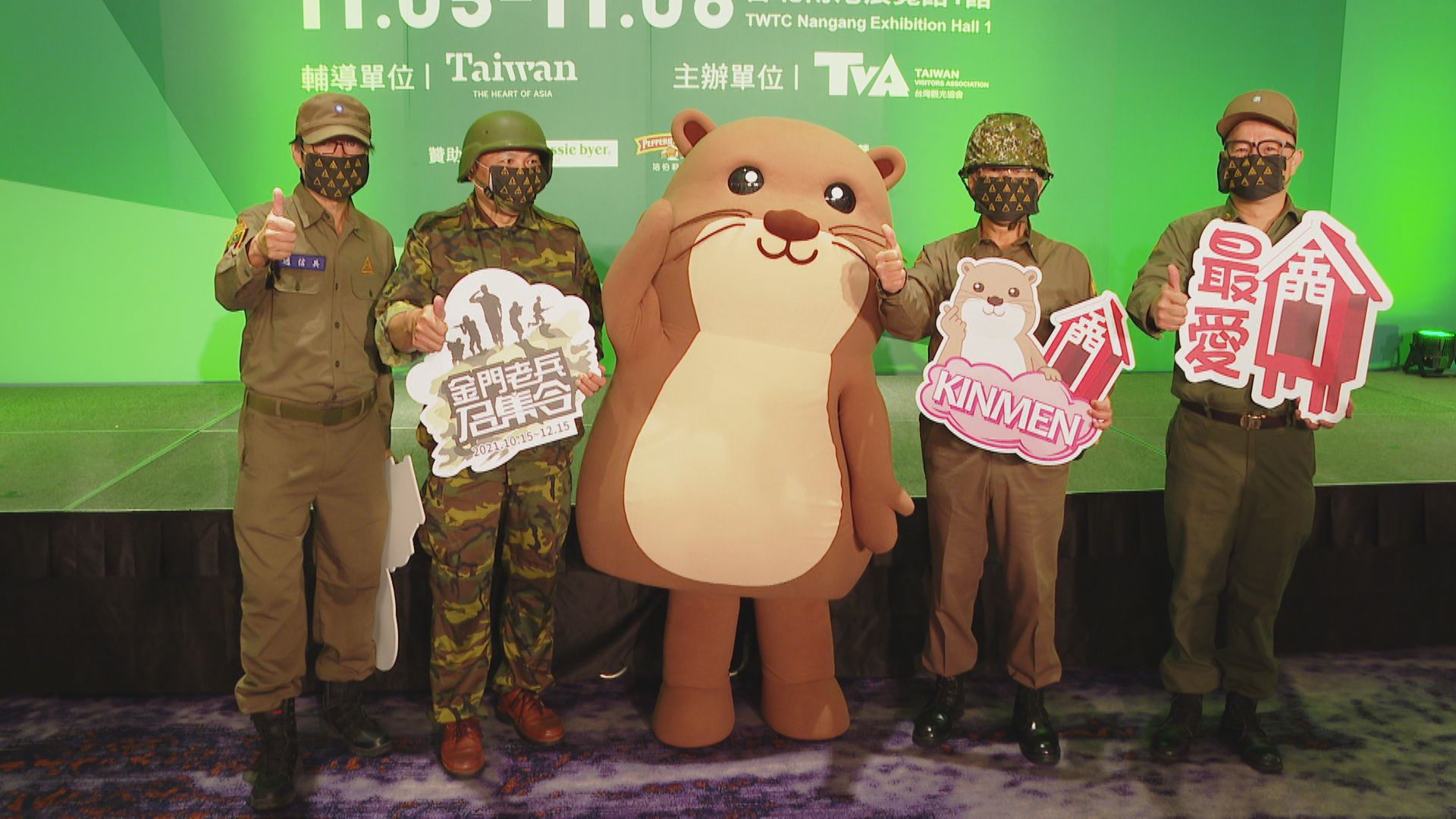 4名老兵和超可愛的金門保育類水獺排排站,金門縣政府邀請全台曾在金門當過兵的男子漢,舊地重遊。金門縣政府舉辦的「老兵召集令」,邁入第4年,只要老兵回到金門旅遊,完成指定任務,就能得到金門高粱和特製口罩。