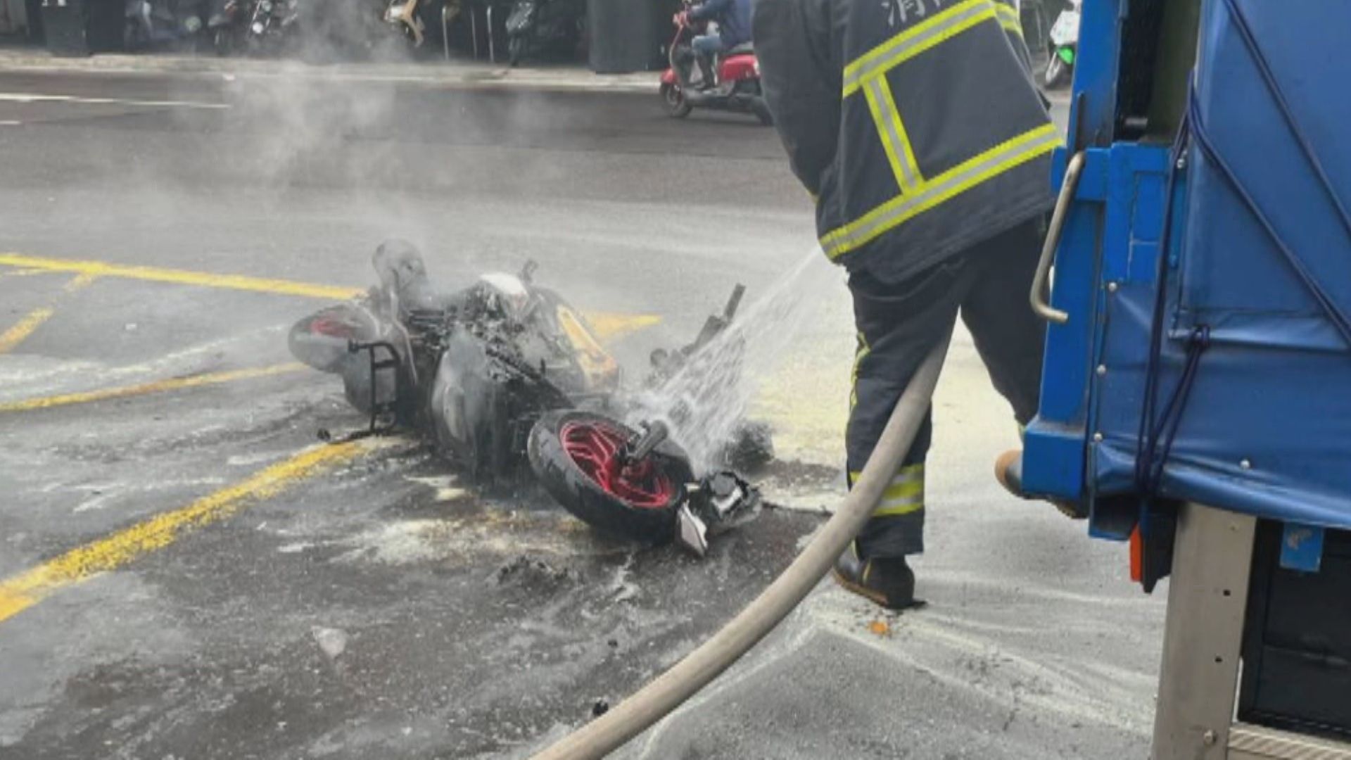 貨車無辜被撞,差點也跟著燒了起來,消防人員拉著水線,對著機車灑水灌救,只見車身、車殼掉落,布滿燒焦痕,受損嚴重。