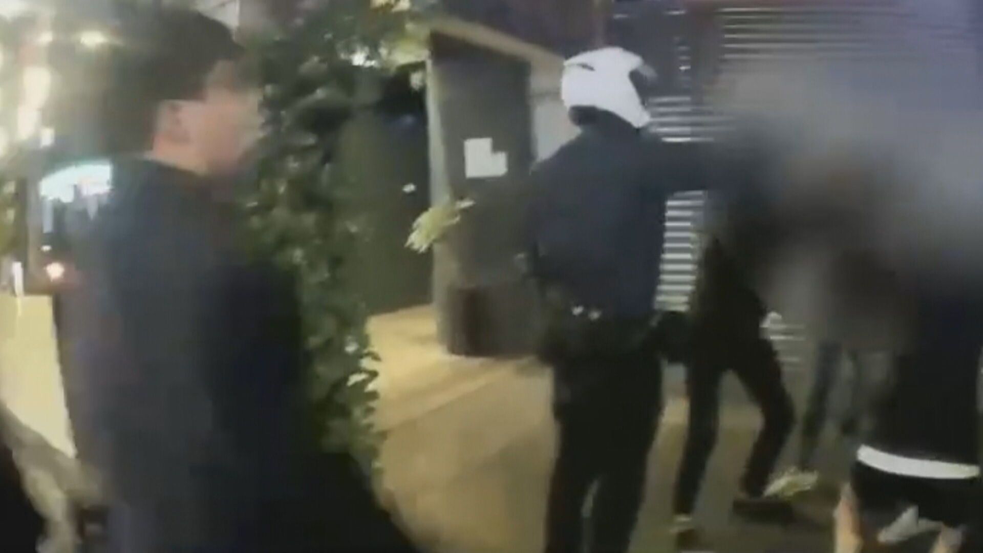 員警獲報KTV前有人打架鬧事,立刻上前壓制,大喊:「趴下、趕快趴下!跪下啦、跪下!」只見這一群人喝得醉醺醺,和警方推擠拉扯。為避免場面失控,員警祭出辣椒水往對方臉上噴,也持續對鬧事酒客喊著:「在那邊給我喊試試看,趕快趴下啦!你在幹什麼?趴下、趴下!」