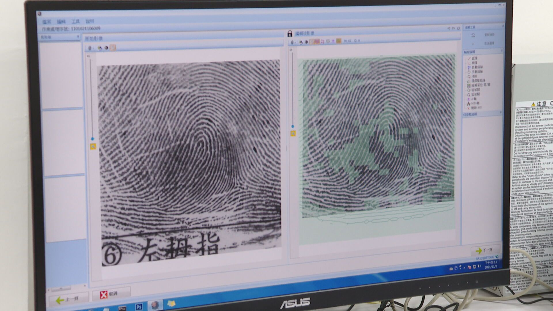 陳躍翔表示:「我們會看到一些線條,會發生分岔或是終止的情形,甚至形成一個特殊的型態,這些我們就稱為特徵點,我們在做指紋檢視的時候,就尋找這些分歧、端點、眼型線,典型的特徵點去做一個確認,把它標記起來。」