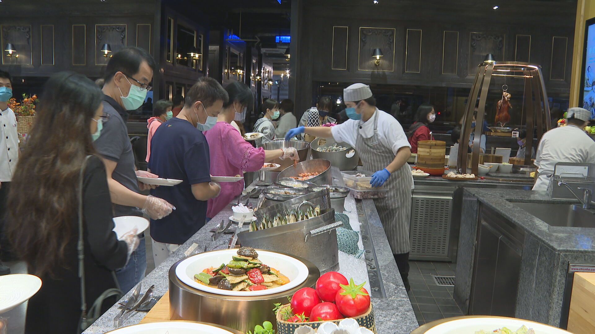 脆皮烤鴨、炙燒燒握壽司、牛排,自助餐檯菜色超澎湃,下午茶用餐時段5分鐘內已經客滿,隨著疫情趨緩,吃到飽的buffet業者迎來人潮。饗賓餐旅集團總經理陳毅航表示:「10月份的營業額已經到4億元以上,明年饗賓大概會有60家的店,大概會差不多是55億元營業額。」