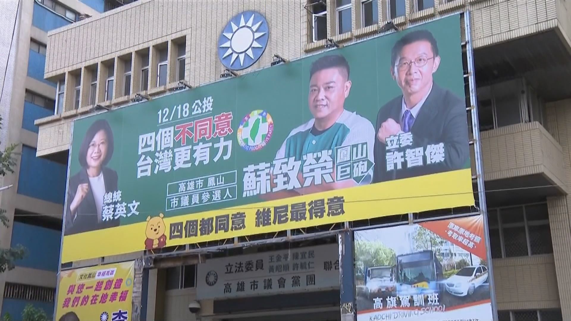 民進黨高雄市議員擬參選人蘇致榮:「在這點地點設立這個看板,也是想要反諷國民黨,不要淪為中國的內應。」國民黨高雄市黨部則表示,鳳山黨部已經變賣,質疑綠營作法,到底是在羞辱公投還是羞辱國民黨?因應年底四大公投案,藍綠陣營各出奇招。