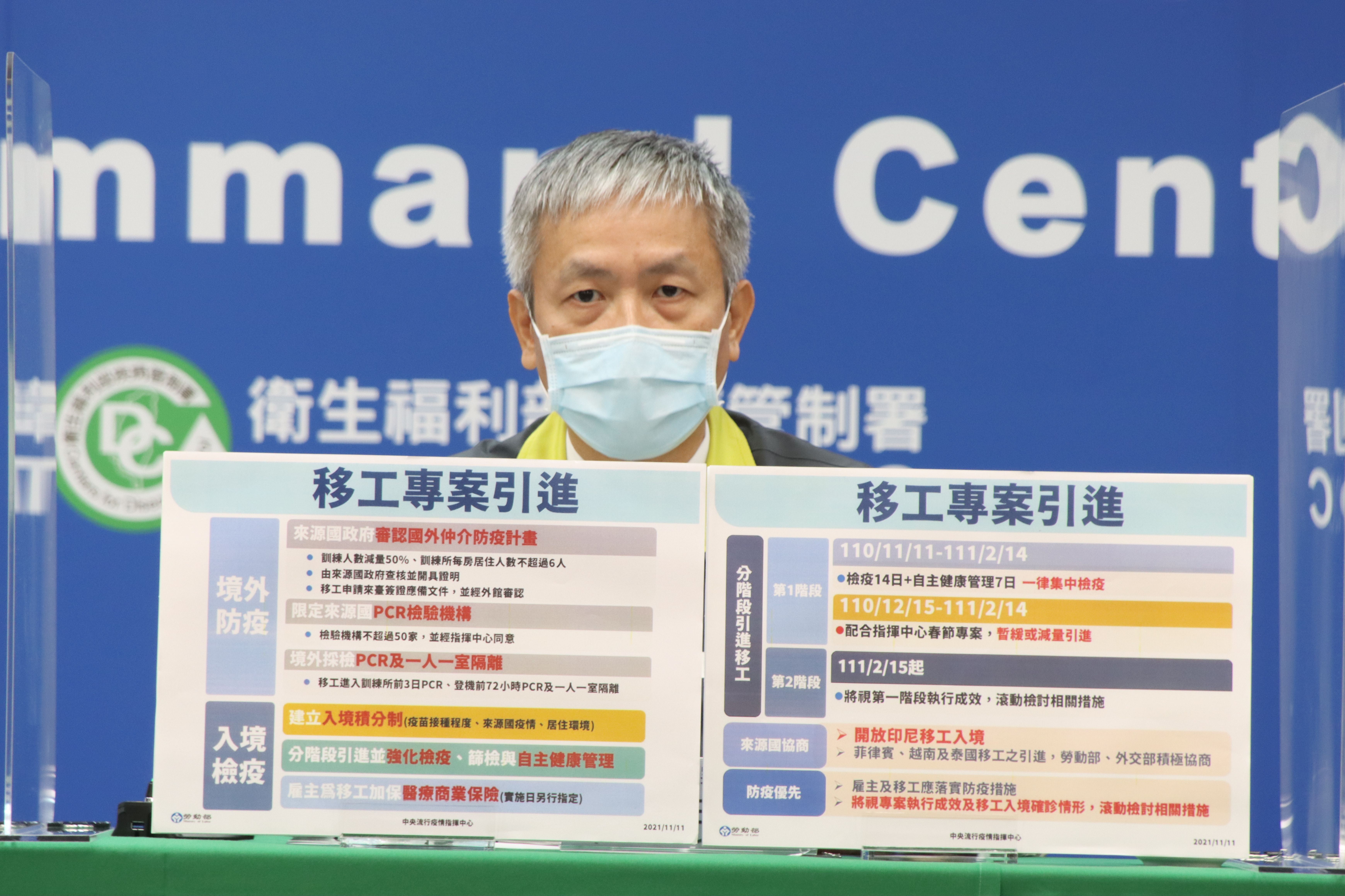 中央流行疫情指揮中心11日表示,鑒於國內疫情已較為穩定,為兼顧產業及照顧人力需求,即日起在落實相關防疫措施之前提下,開放移工專案引進,並採二階段專案,明年2月14日前移工入境全數採集中檢疫,並遵守境內外防疫措施。