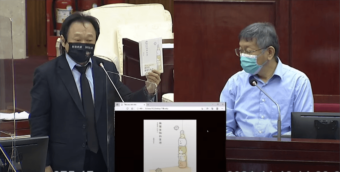 台北市長柯文哲12日赴市議會市政總質詢,民進黨市議員王世堅按照往例送上「禮物」,拿出一本卡通人物「角落生物」繪本,諷刺柯文哲是「角落政客」,支持度低卻成天攻擊中央,造成社會紛擾。