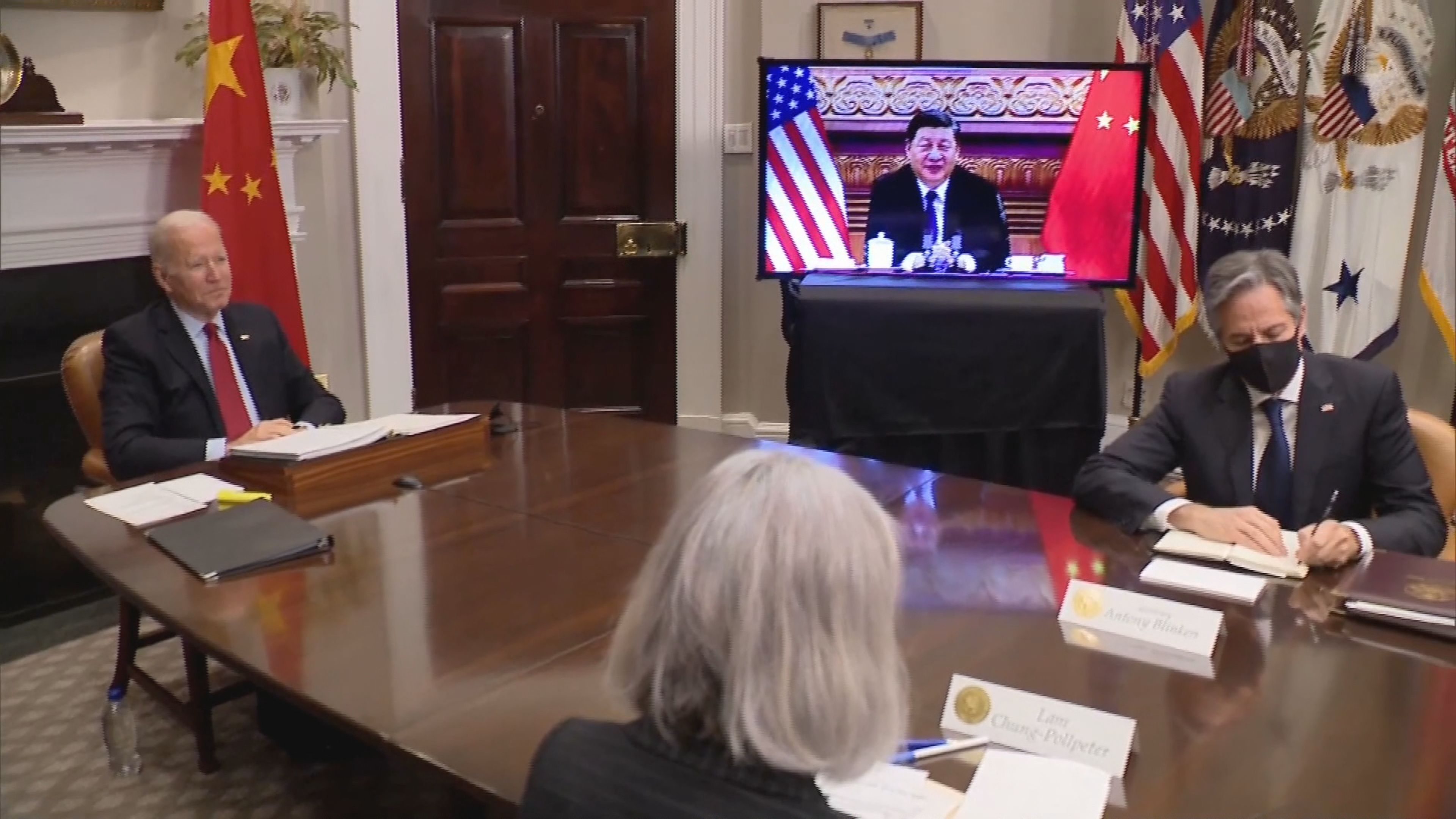 全球矚目的美中元首視訊會談終於登場,拜登表示:「我們需要建立競爭合乎常理的護欄,坦誠地對待我們之間的分歧,在我們的利益交會的地方共同努力,尤其是在氣候變化等重要的全球問題上。」雙方視訊會議氣氛看來嚴謹,時而嚴肅、時而輕鬆。美國國務卿布林肯、財政部長葉倫等重要官員陪拜登與會,可以看到拜登露出笑容。