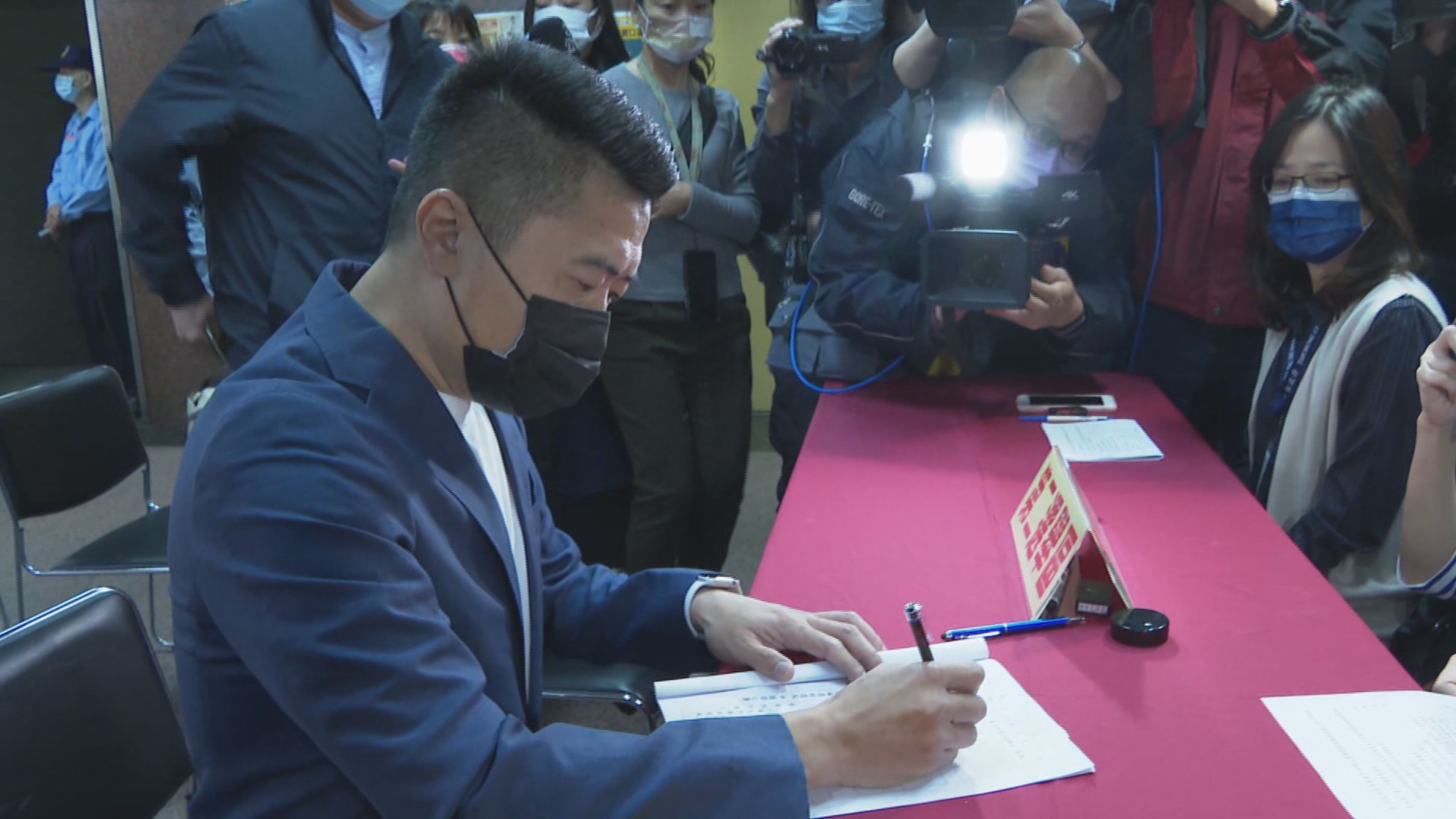 中二選區立委參選人顏寬恒在媒體的簇擁下,上午隻身一人到台中選委會完成立委補選登記,顏寬恒表示:「今天是我第一次自己一個人來登記,那這也是一個必要的程序,那我想說盡量簡單就好。寬恒最大的靠山,就是我們在地的所有鄉親。」