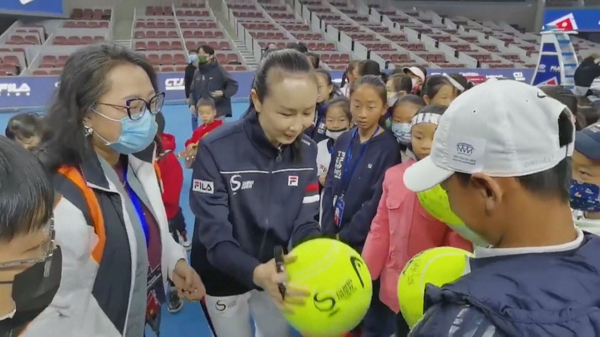 21日中國官媒《環球時報》總編輯胡錫進,在推特上釋出,彭帥出席北京青少年網球決賽的開幕式的最新畫面。只見中國網球名將彭帥親切地替小朋友一個一個在球上簽名,彭帥露出笑容。