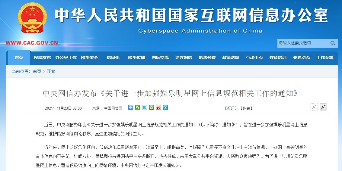 中國國家互聯網信息辦公室微博「網信中國」23日表示,近日印發一份「關於進一步加強娛樂明星網上信息規範相關工作的通知」,加強演藝圈明星網路訊息規範,維護網路上的輿論秩序。