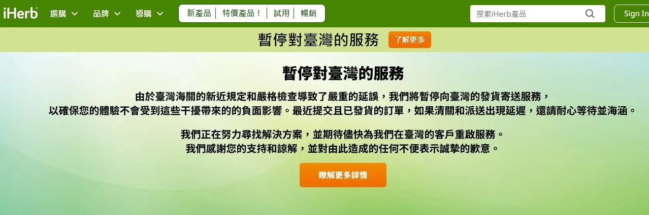 iHerb在官網上公告,表示因台灣海關的新近規定和嚴格審查,導致嚴重延誤,決定暫停向台灣發貨寄送服務,確保消費者不會受到這些干擾的負面影響,目前官方正在尋找解決方案,並儘快提供台灣消費者服務。