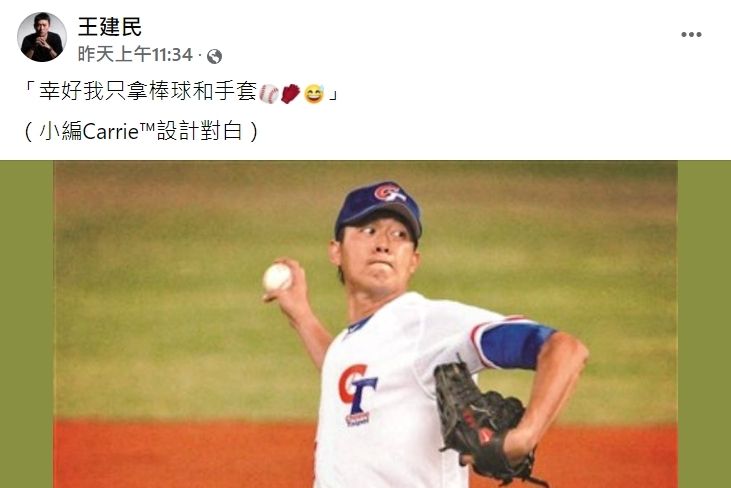 王建民曾效力於美國職棒大聯盟紐約洋基隊與許多隊伍,位置為投手,現則擔任中信兄弟二軍投手教練。他的非官方粉絲專頁「王建民」24日發文,開玩笑表示:「幸好我只拿棒球和手套。」此文被許多網友認為應是針對內政部的球棒註記政策,引發廣大迴響。