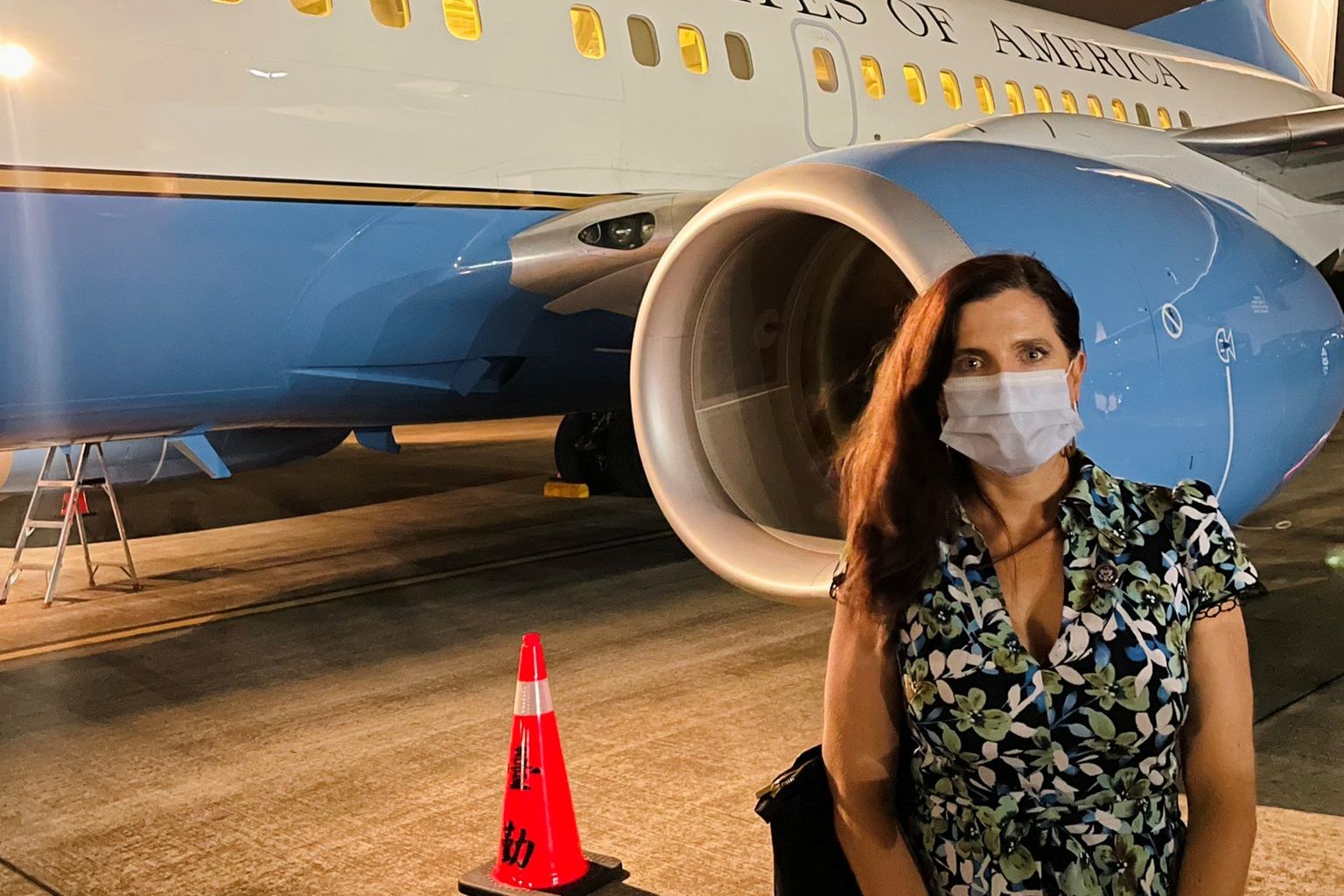 梅絲眾議員25日晚間抵台時,也與所搭乘的行政專機合照,並在推特上發文「Just touched down in the Republic of Taiwan.」(剛降落台灣共和國),許多台灣網友亦在該則推文底下回應,歡迎她來到「台灣共和國」。
