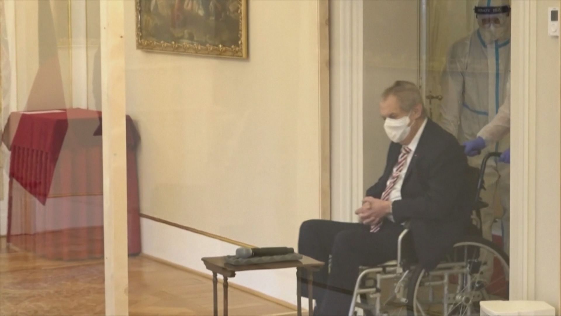 身穿防護衣的人員,推著輪椅上的捷克總統齊曼,進入一個透明隔間。捷克總統齊曼:「我將任命彼得費亞拉為新任總理。」