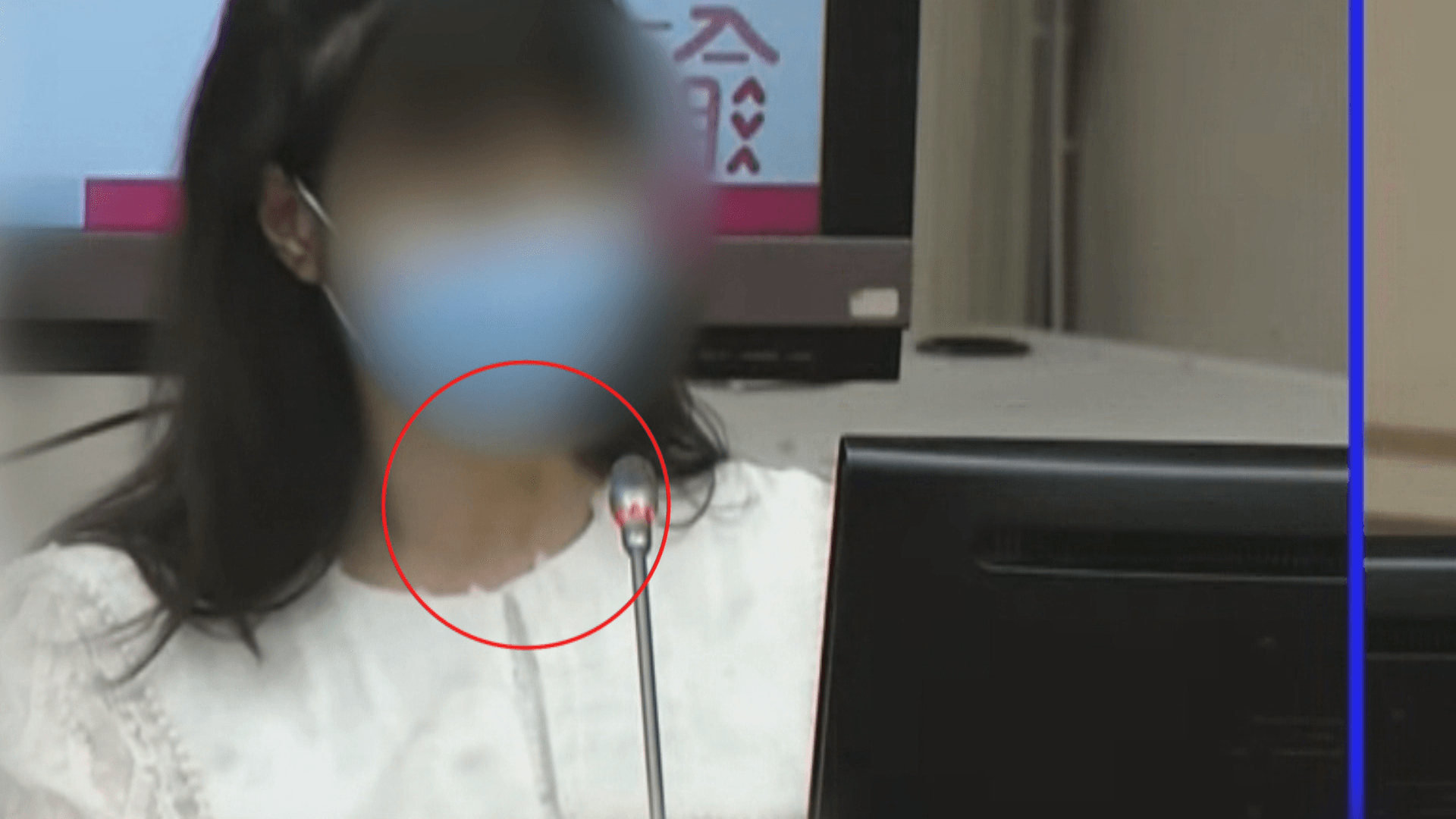 在29日的財政委員會上,女性國會議員問政犀利、砲火猛烈,只是仔細看,委員脖子上怎麼會有瘀青?放大照片看得更清楚,離譜的是不只脖子而已,甚至右手還有多處結痂,傷勢看來已經一陣子了。但瘀青怎麼來?原來11月11日這名女性國會議員疑似遭到男友家暴,導致全身傷痕累累。