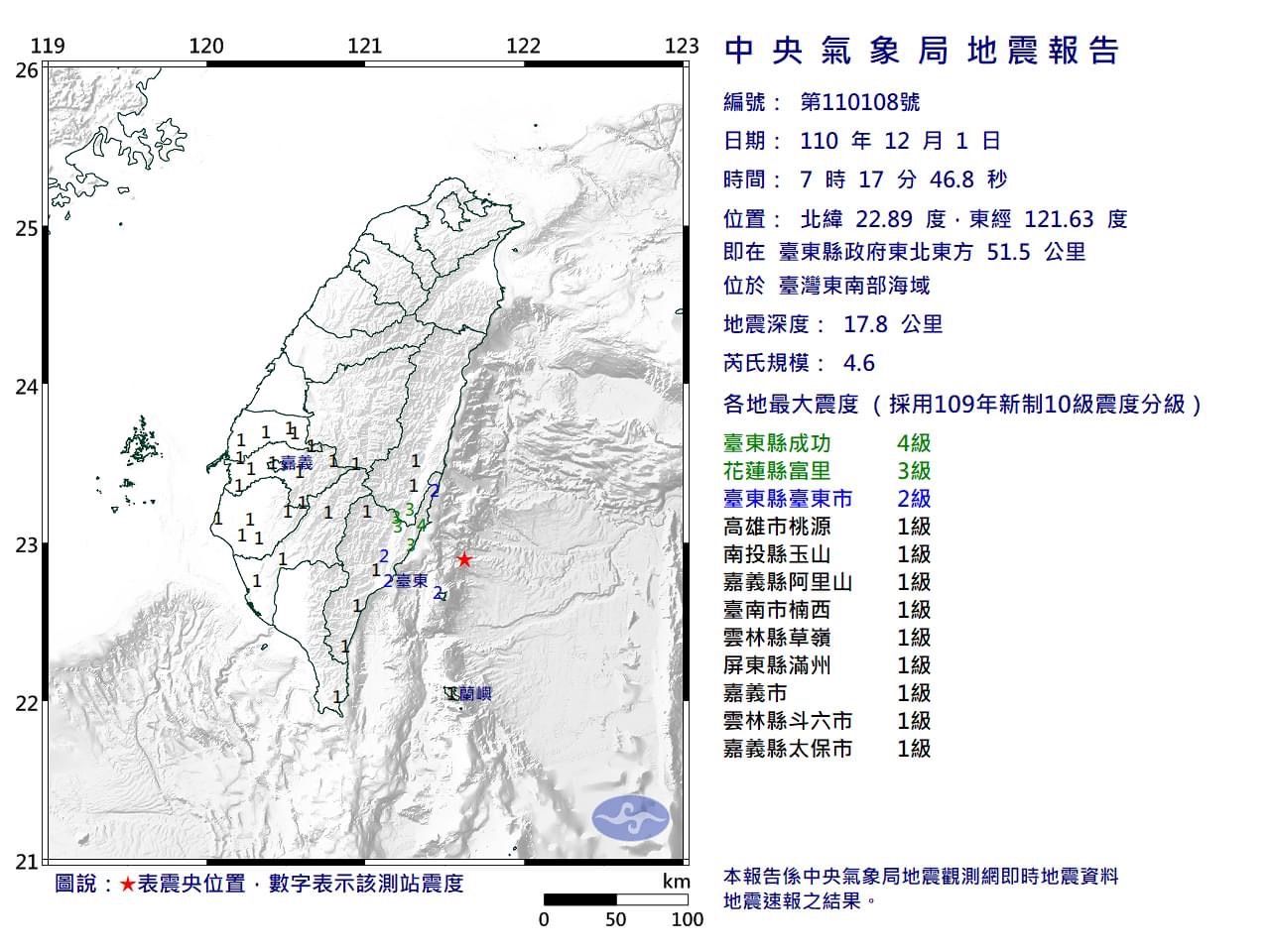 11月29日花蓮縣才發生規模4.5地震,今(1日)早上7時17分,又有地震發生,台灣東南部海域發生規模4.6地震,地震深度17.8公里,震央在台東縣政府東北方51.5公里,最大震度為4級。