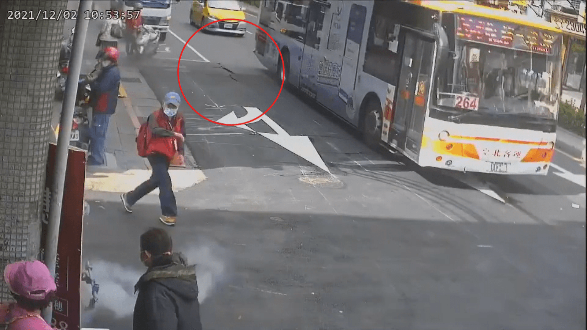 發生氣爆瞬間,路邊柏油裂開,更誇張的是,氣爆導致人孔蓋彈起,剛好開過去的公車因為爆炸威力驚人,車尾一度都被抬起來,後方車輛目睹驚險瞬間,趕緊繞道而行。