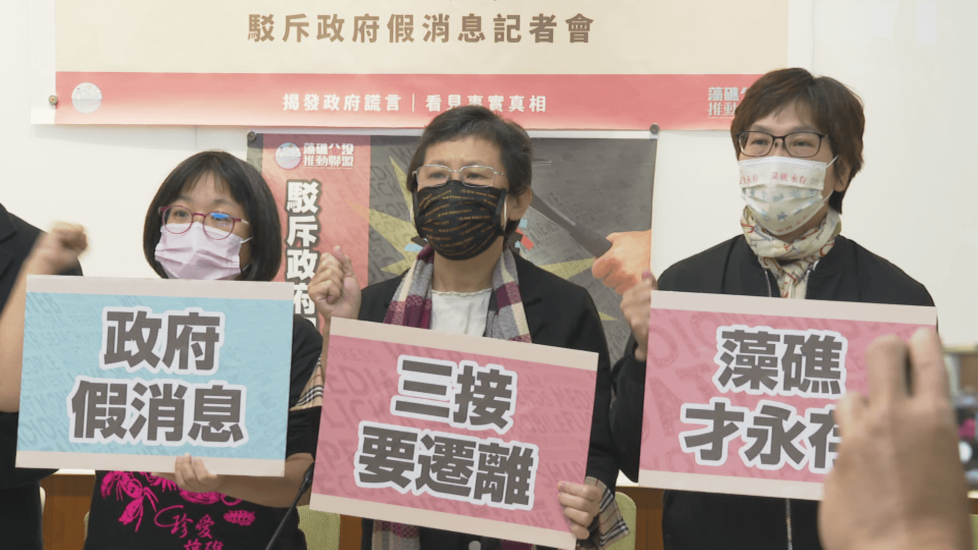 環保團體與在野立委一字排開,要駁斥蔡政府的假訊息,珍愛藻礁公投提案人潘忠政指出:「他們都自己承認,他們是非常保守地說他們只影響了0.4公頃,他們講的0.4公頃指的是這個棧橋的橋墩。」潘忠政拿出圖片,證明三接確實就蓋在藻礁上,蔡政府說法和事實的確有出入,三接議題上環團緊盯政府一言一行。