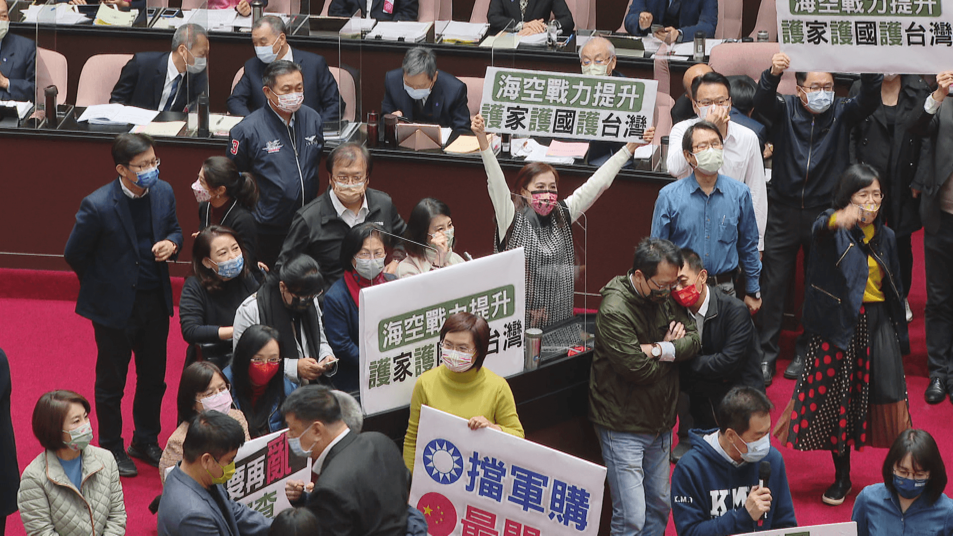 國民黨團手舉標語,齊聲吶喊說行政院長是小偷,藍綠兩黨一早甲動備戰,國民黨團因為不滿政府用行政資源介入公投,霸佔質詢台,要杯葛蘇揆,而民進黨也不甘示弱,反嗆國民黨才是小偷,因為蘇貞昌原本該來立院,針對國防特別預算進行施政報告,現在卻只能無奈在座位上等報告。