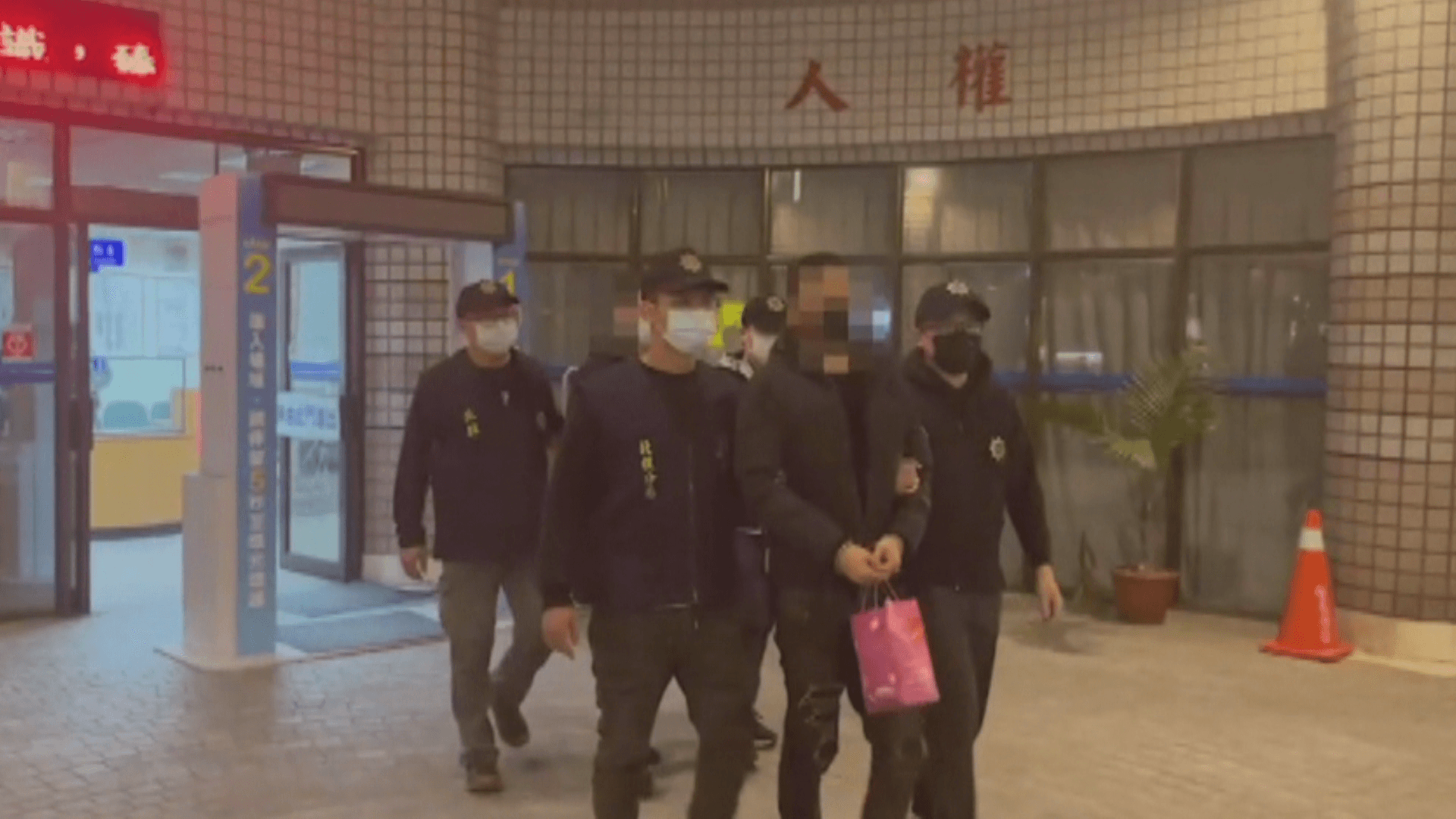 身穿黑色羽絨外套的擄人案主嫌,主動來到警局投案,不過員警卻拿出拘票,將人上銬逮捕,因為他的身分來頭不小,犯案後立刻就被警方盯上。