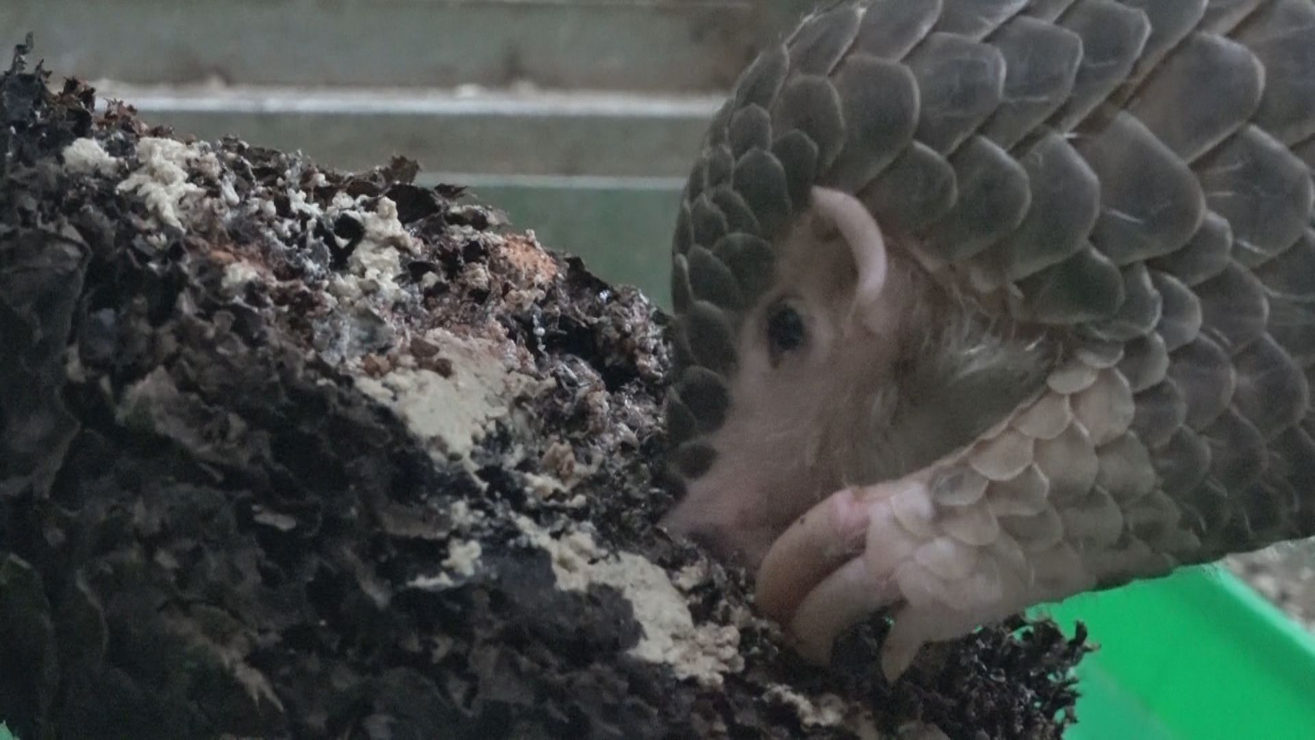 黑溜溜的小眼睛,配上一身甲殼,短短的小手,專心吃著午餐,牠是台灣保育類穿山甲「潤喉糖」,平日賣臉吃飯,這回身負重任,要來做外交。