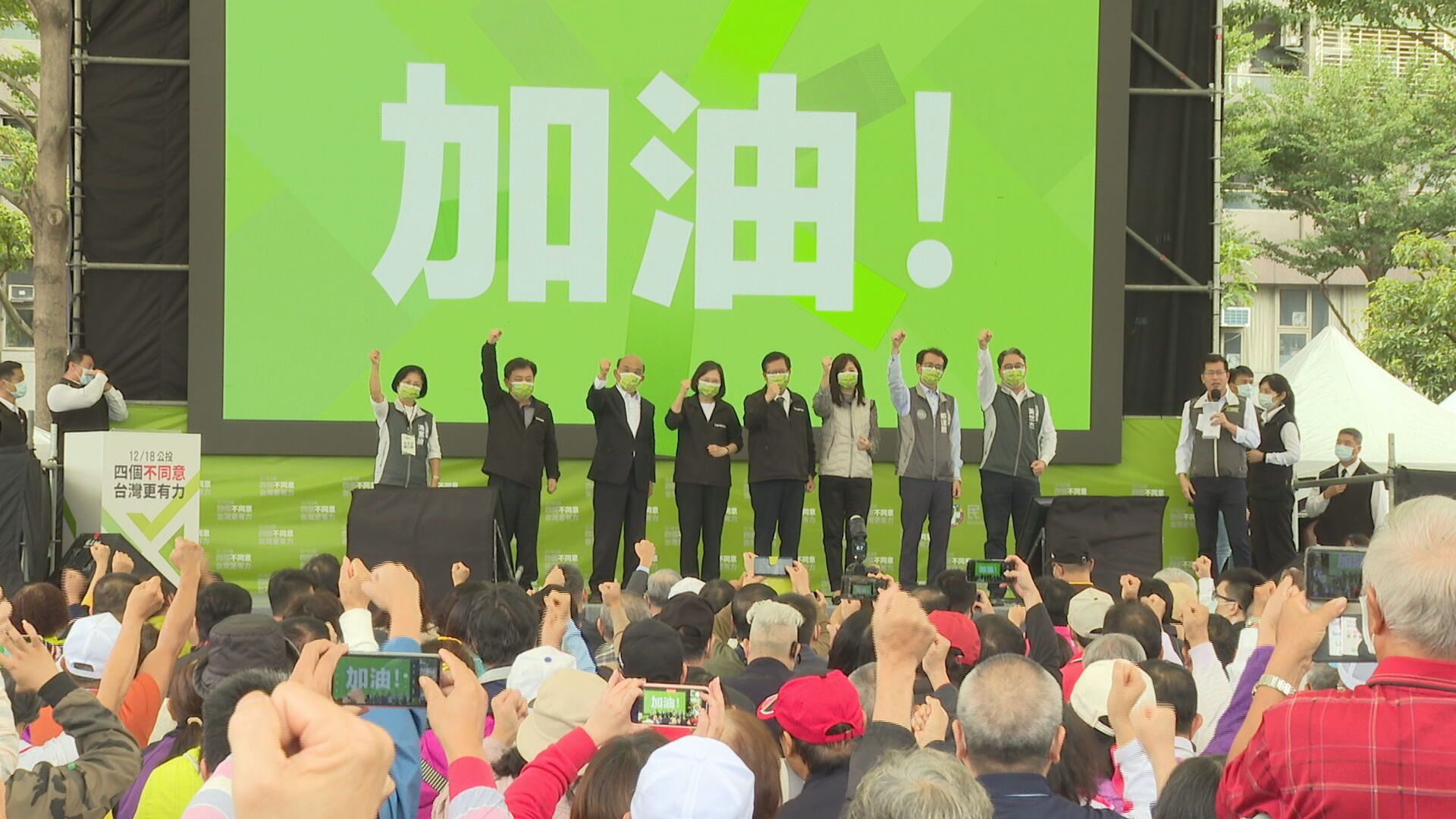 蔡英文:「只要你支持台灣繼續進步,那你就是台灣隊的一份子,我們就是台灣隊友。1個人拉4票,也就是4個不同意,幫我向你們的親朋好友拉這4票,這4票不是要選誰,是選擇你的未來。」1人拉4票,代表4個不同意,公投攸關台灣未來方向,民進黨總動員,誓言守住四大公投。