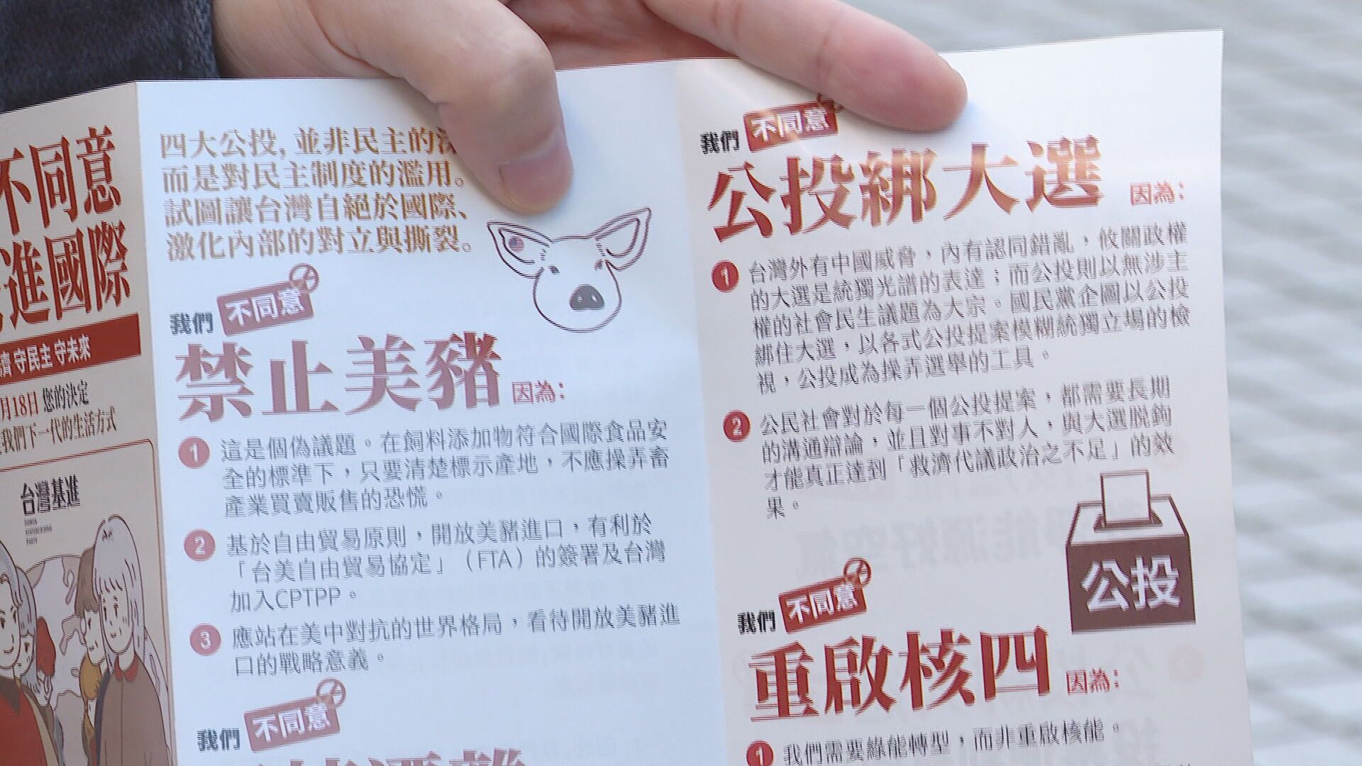為力拚1218公投,各政黨不只展開街講,更開始推出文宣傳單等小物,《鏡新聞》獨家掌握,基進黨公投傳單儘管全台各地發送,但網友則發現,明明公投主文反的是萊豬,卻硬是寫成反美豬,質疑有誤導民眾嫌疑,對此中選會強調非選務相關,不多做任何回應。
