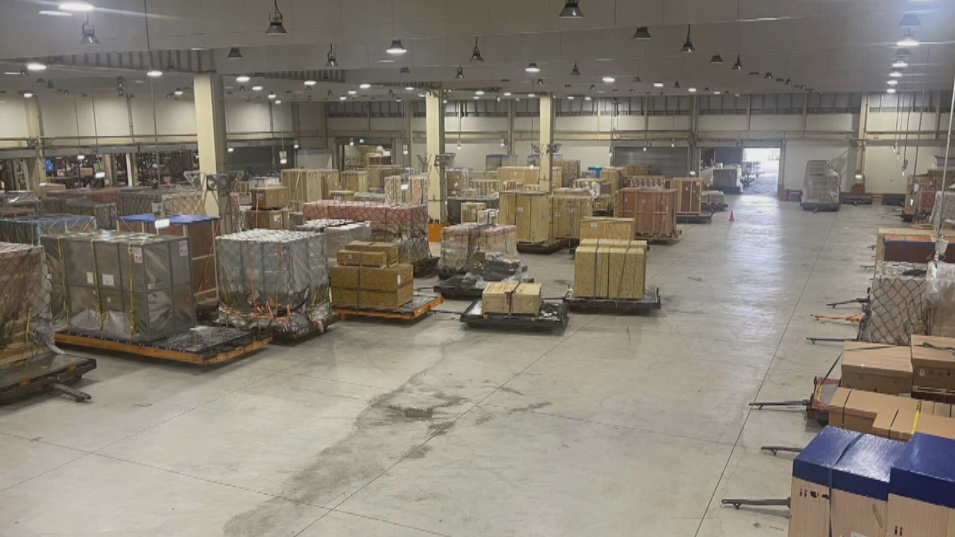 桃機停機坪擺滿貨物,裡頭除了浴缸還有運動器材,航空貨運近期漲勢不斷,去年美東線每公斤500元,美西線430元,現在雙雙漲到600到650元,急件甚至要700到750元,甚至還有不少出口業者搶先包下貨機。